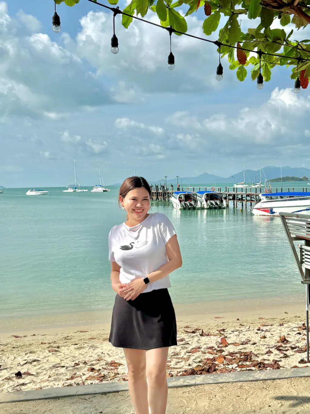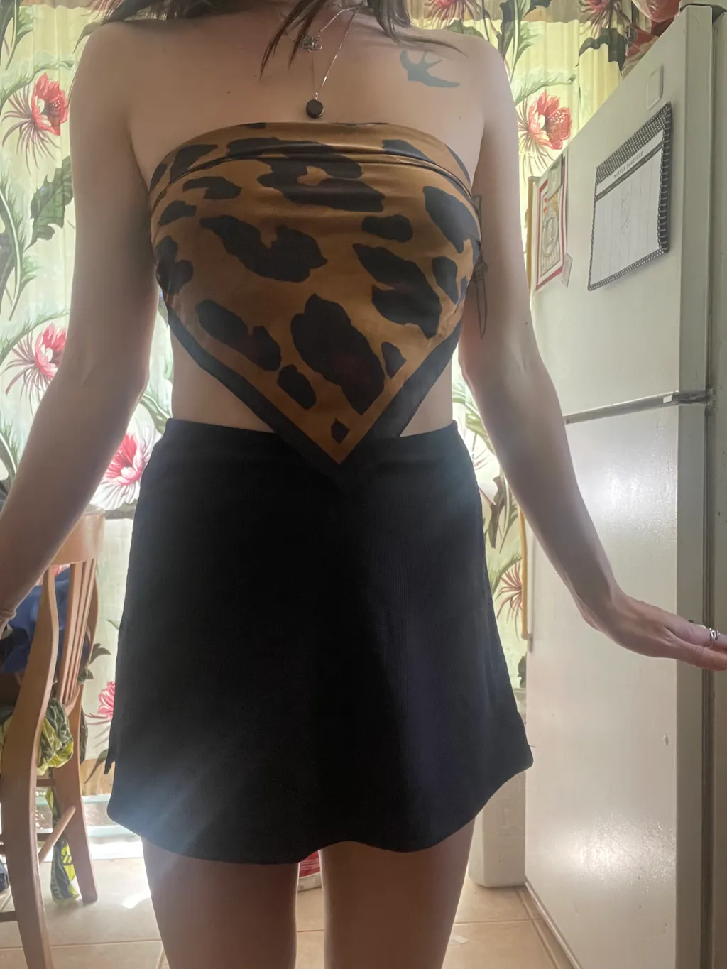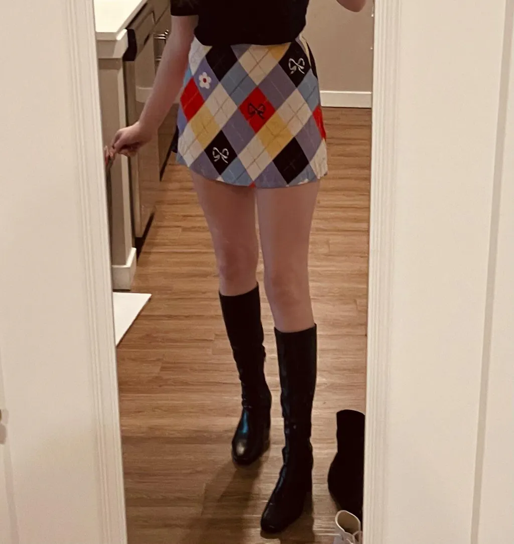 A high-waisted mini skort in a comfy stretch rib fabric. Features built-in shorts for a fit that's both comfortable and practical.
