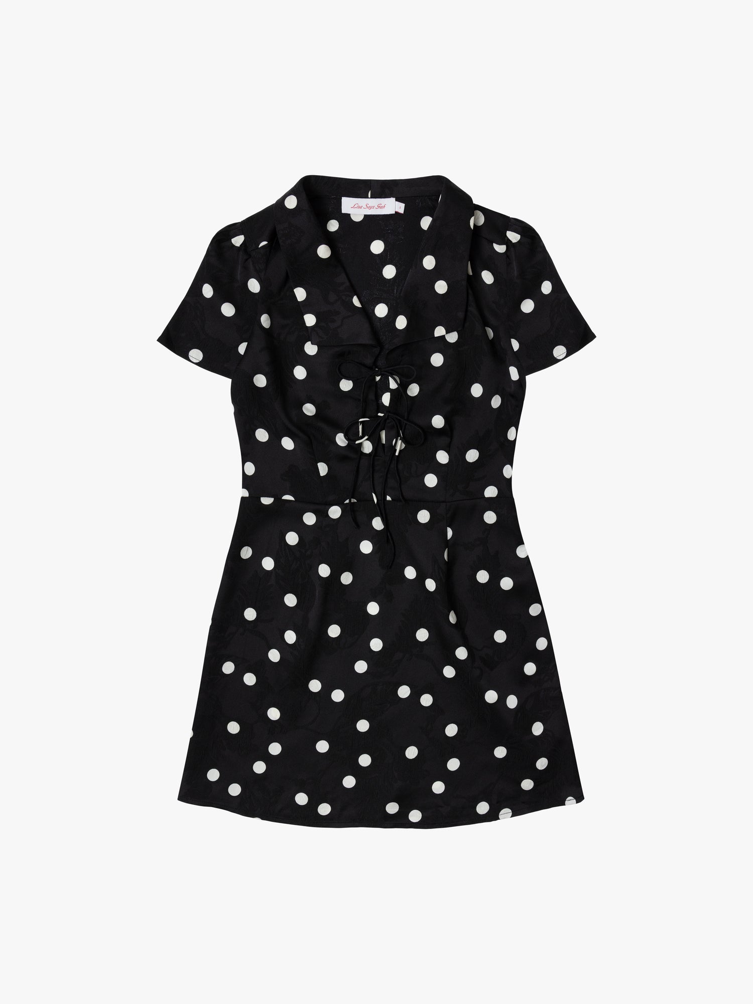 Our Alexa Shirtdress is a short sleeve mini dress that features a collar, tie closures on the front, and a side zip enclosure. This dress is featured in our signature LSG black dot print. For a more fitted look, we recommend sizing down!
