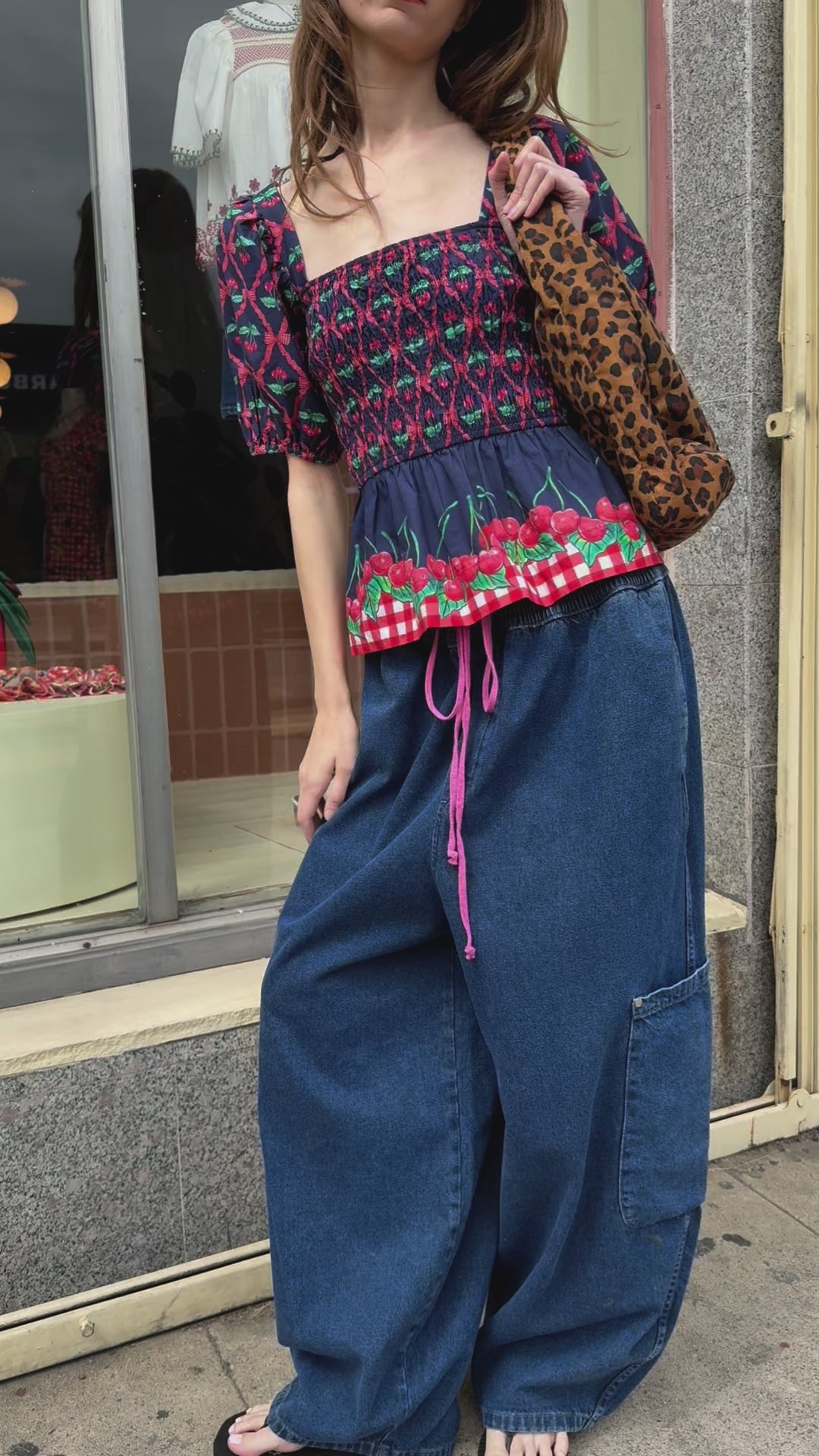 The Allegra Blouse features a bold Cherry Pie print, puff sleeves, a lace-up back, and a peplum hem. The shirred body creates a flattering, cinched fit. Pair it with the matching Pull On Shorts in Cherry Pie for a coordinated look.
