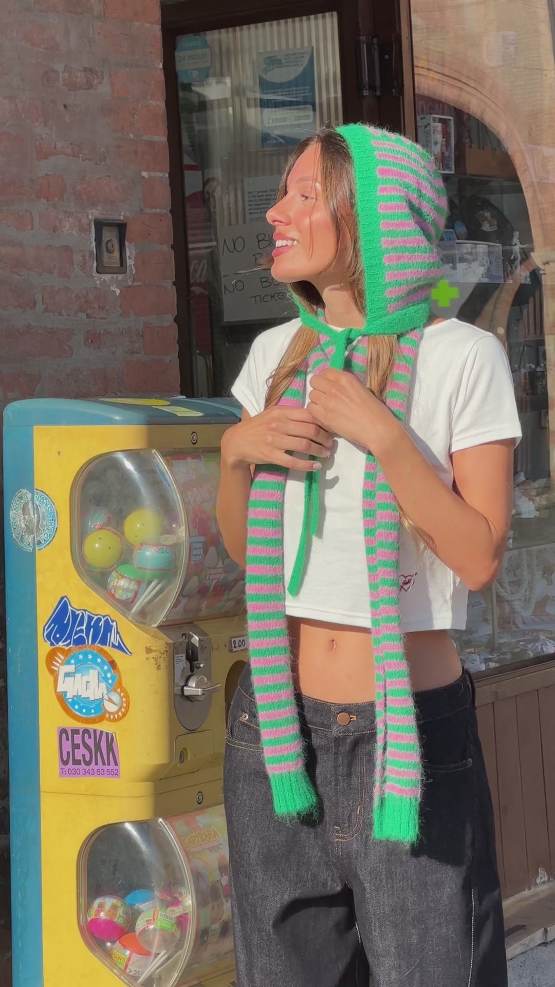 The Alma Bonnet is a playful striped knit finished with cozy ties that secure under the chin. Soft, warm, and effortlessly charming, it’s the perfect companion to the Alma Sweater and Scarf.