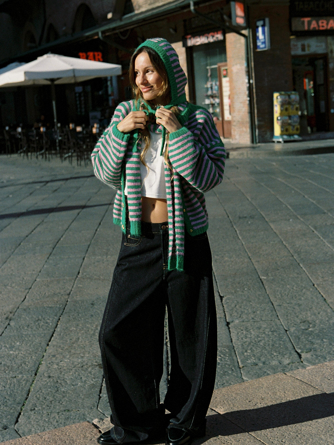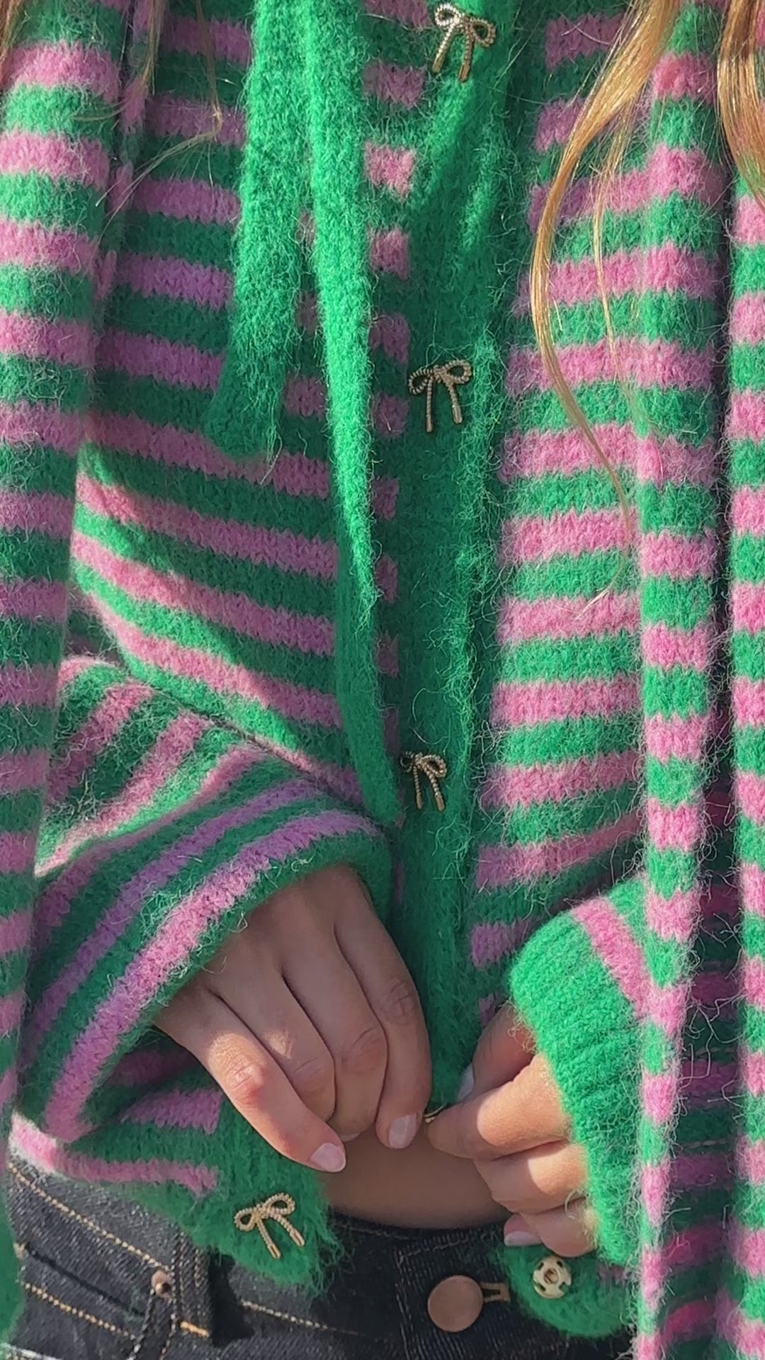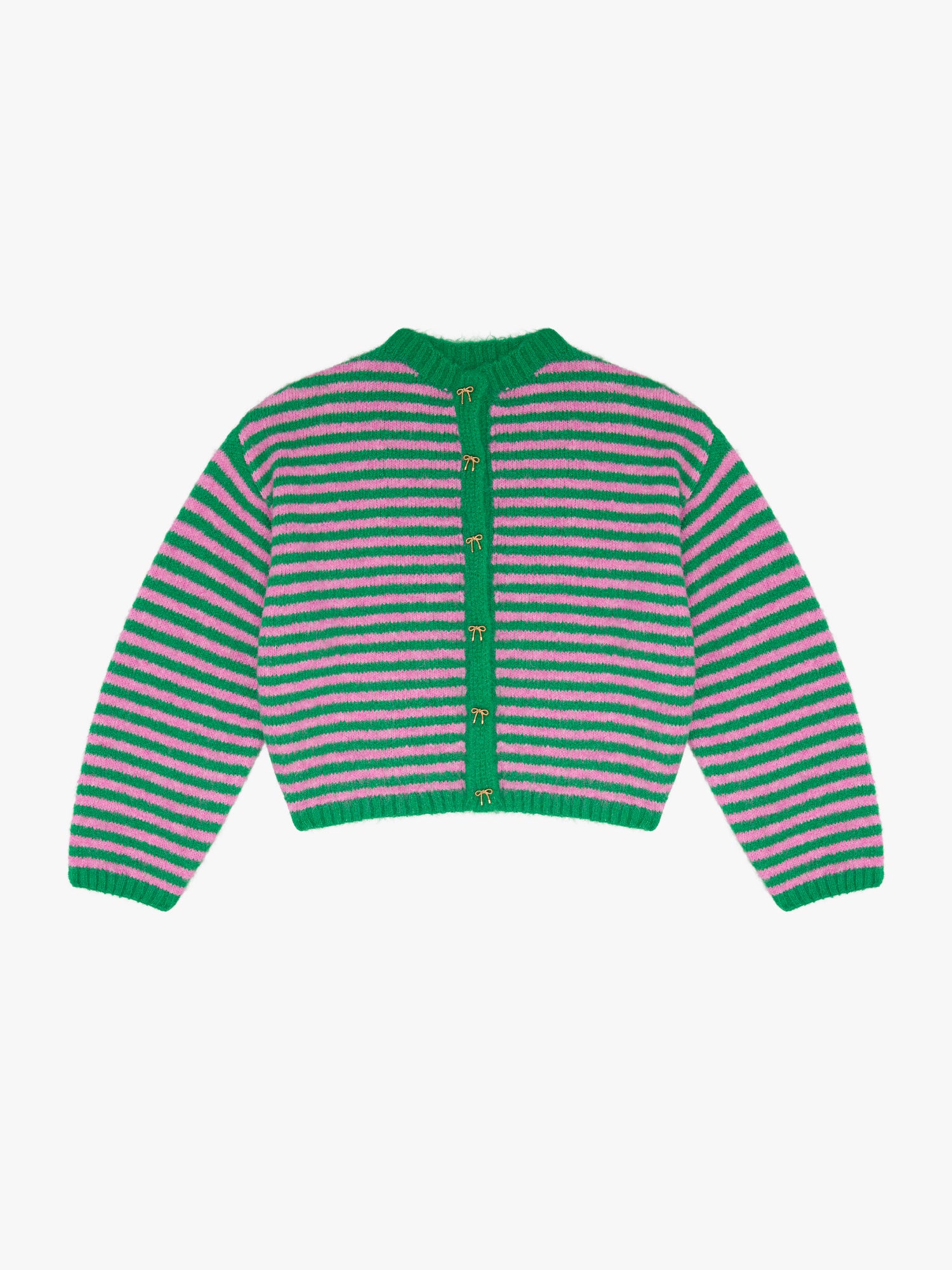 The Alma Sweater is a playful striped knit with a cropped, boxy fit. It features hidden snap closures down the front, accented with gold decorative bow buttons for a sweet finishing touch. Cozy ribbed trim adds structure, while the bold stripes keep it fun. Complete the look with the matching scarf and bonnet.