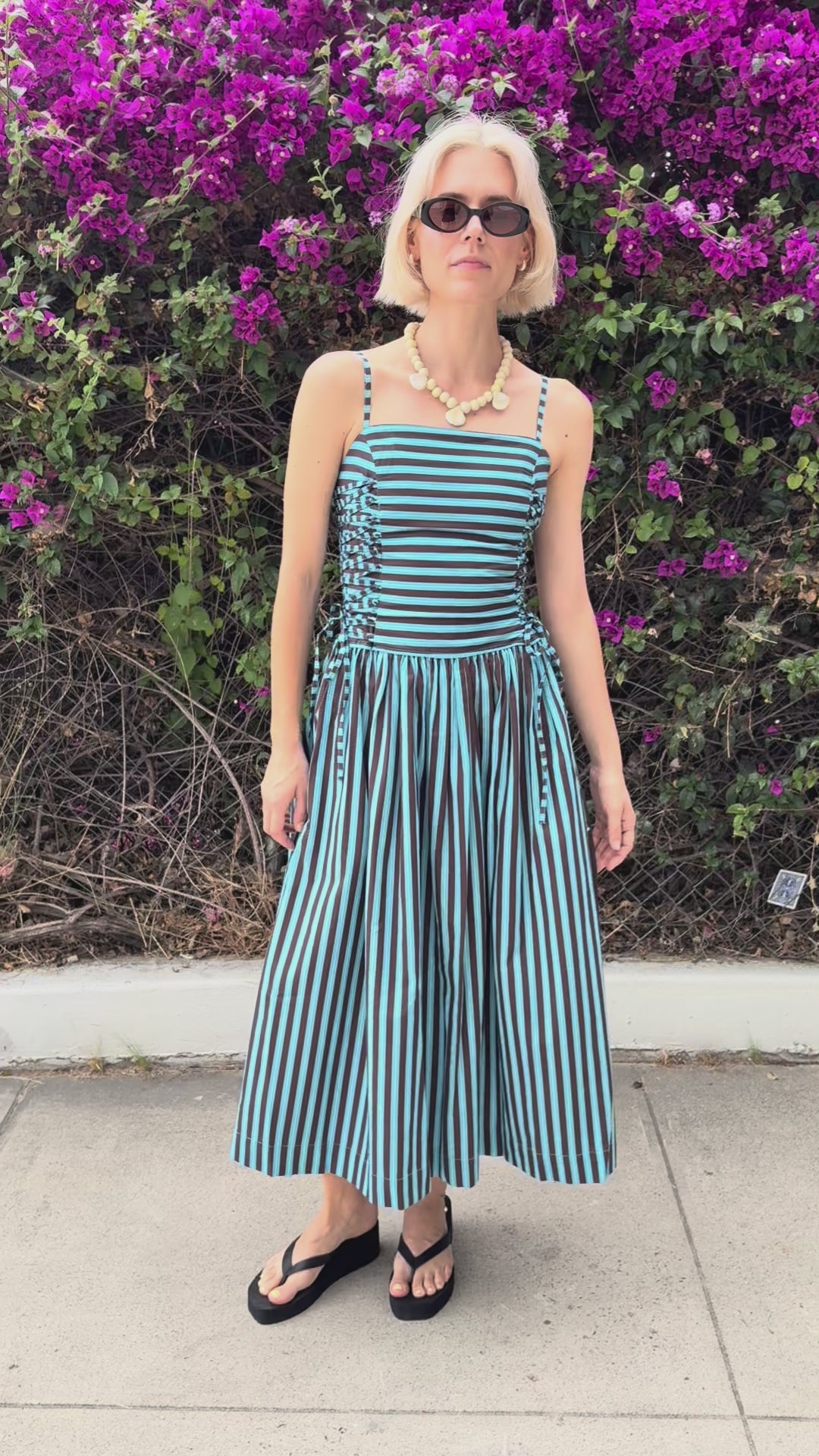 Spaghetti strap midi dress with a square neck, adjustable ties at the side of the bodice, pockets at the side of the skirt, and made in a gorgeous blue and brown stripe pattern.