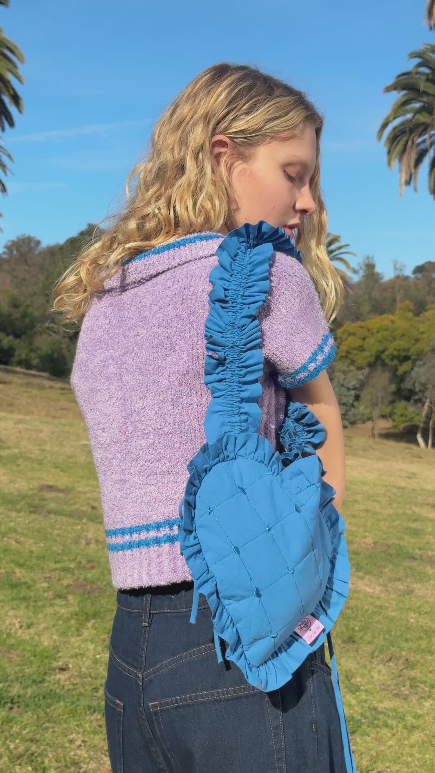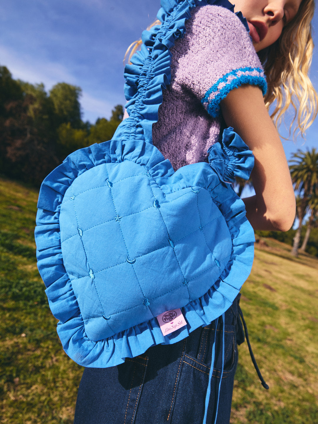 Blue quilted bag in the shape of a heart, featuring ruffle details and an adjustable strap for versatility.
