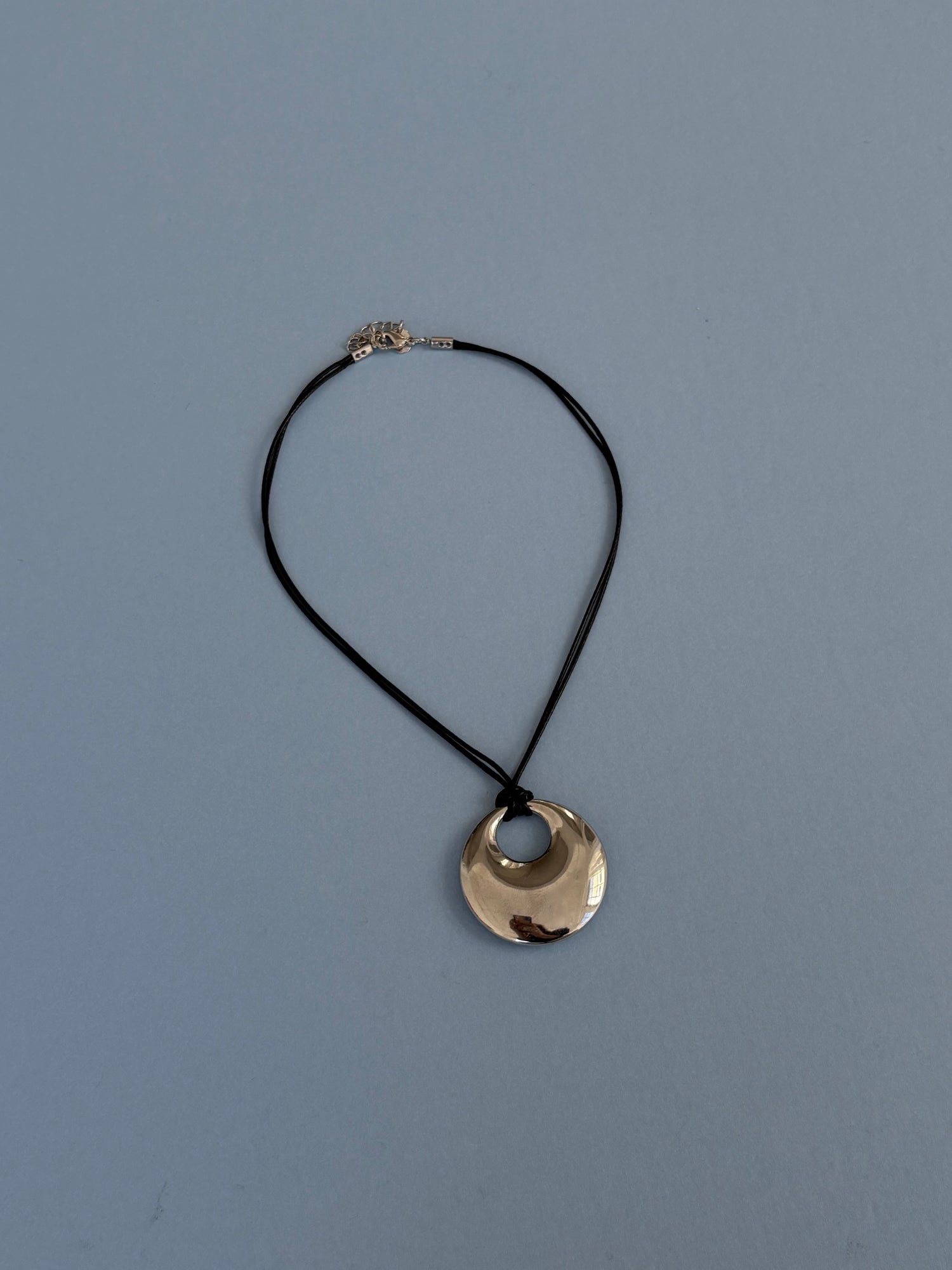 Silver necklace from Gemini Jewels featuring an adjustable corded chain and a large silver pendant.