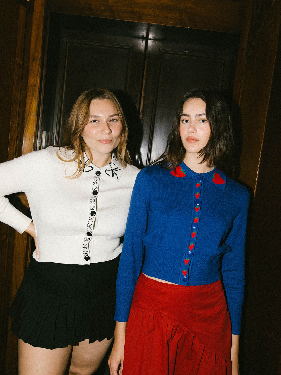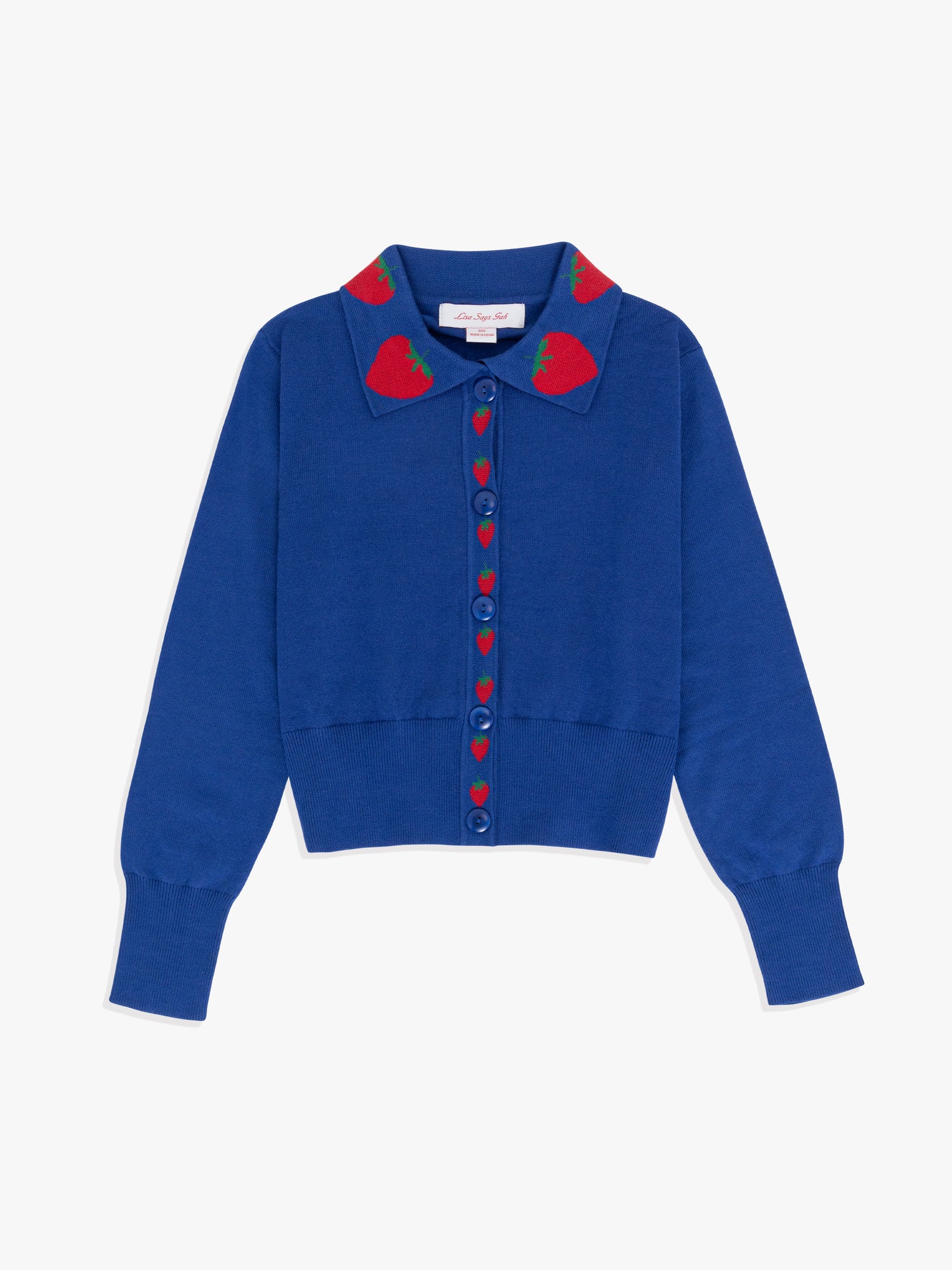 Collared blue cardigan featuring an exclusive LSG strawberry intarsia knit design along the collar and trim. 🍓 This sweater is a fitted style with a slightly cropped body.
