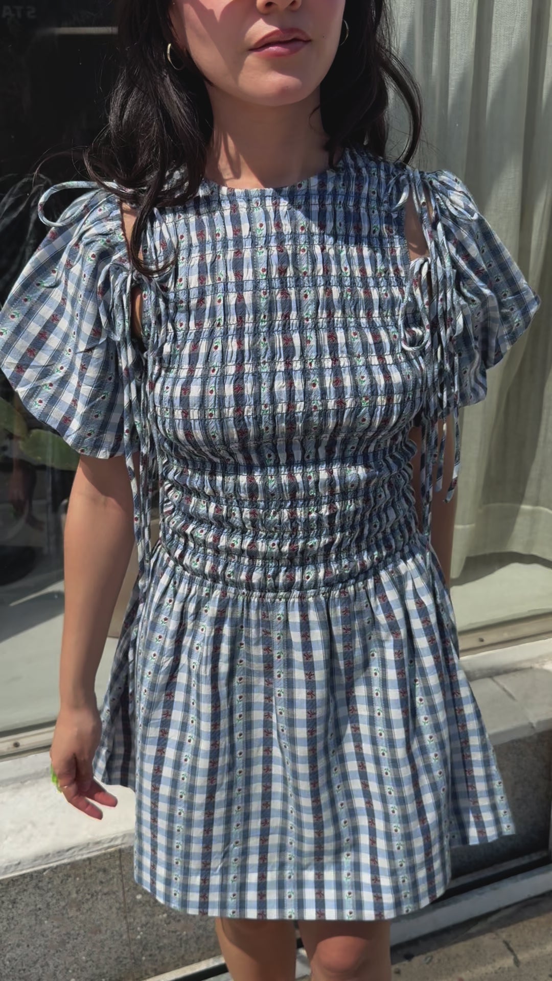 Mini bubble dress featured in a cute floral print with removable puff sleeves and smocking at the bodice for styling and fit versatility.
