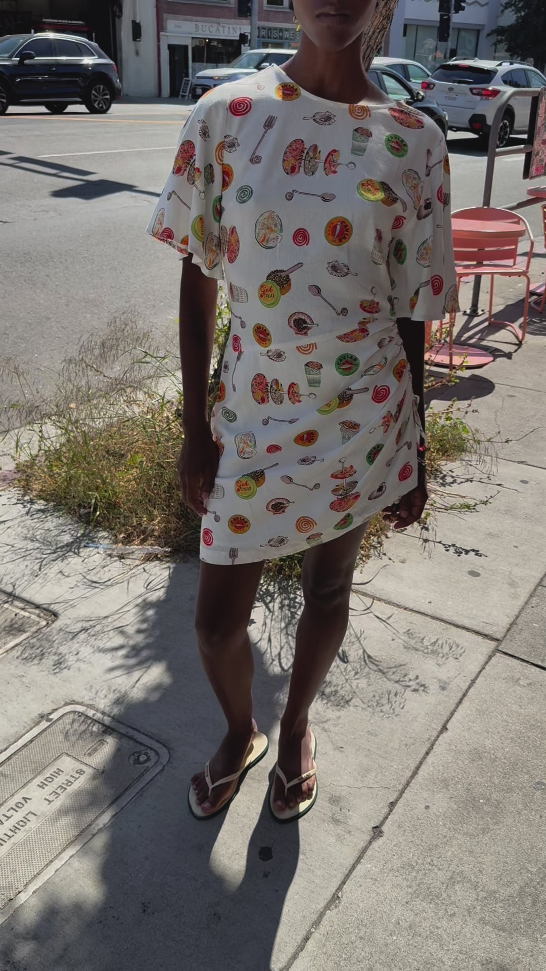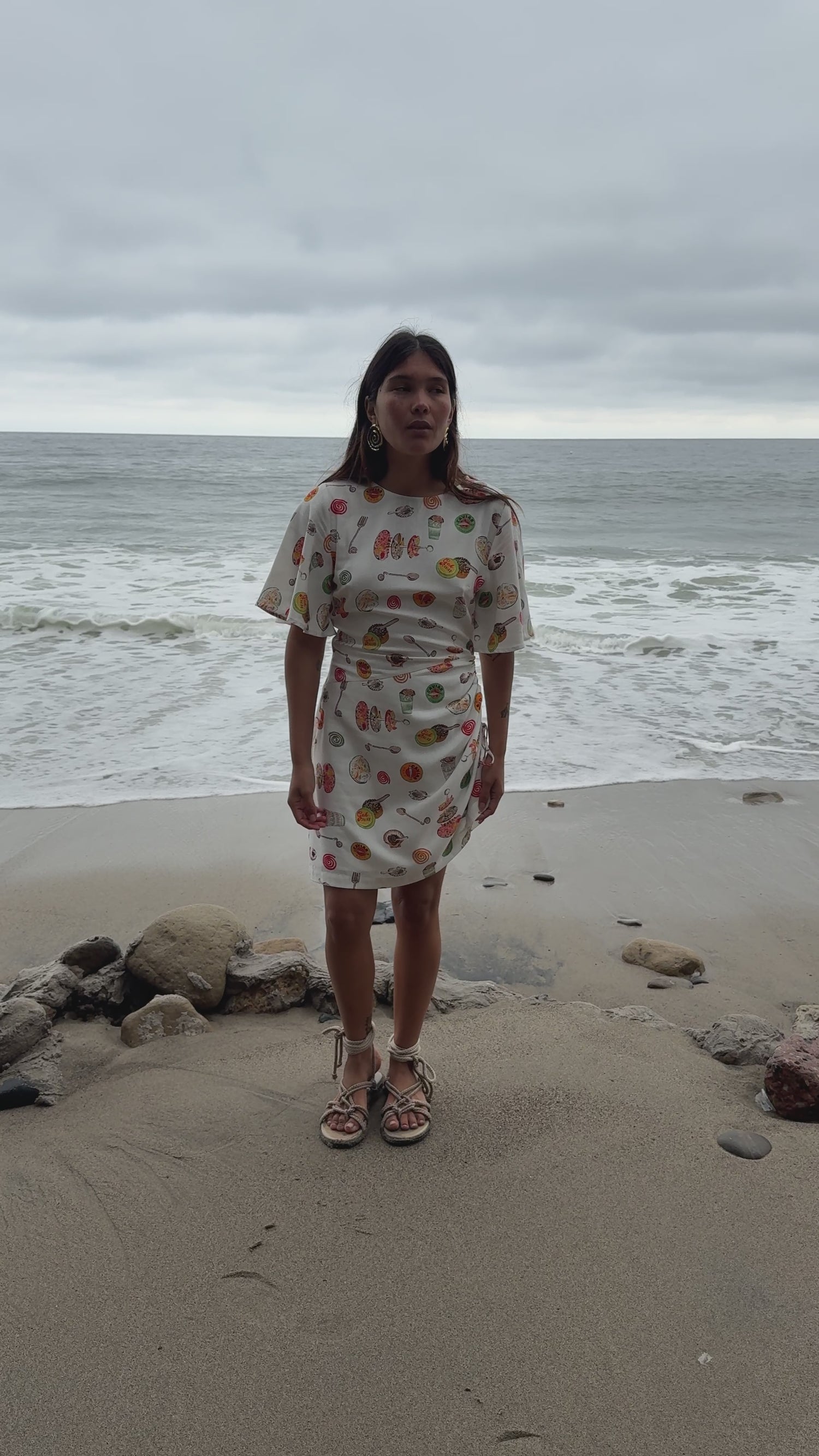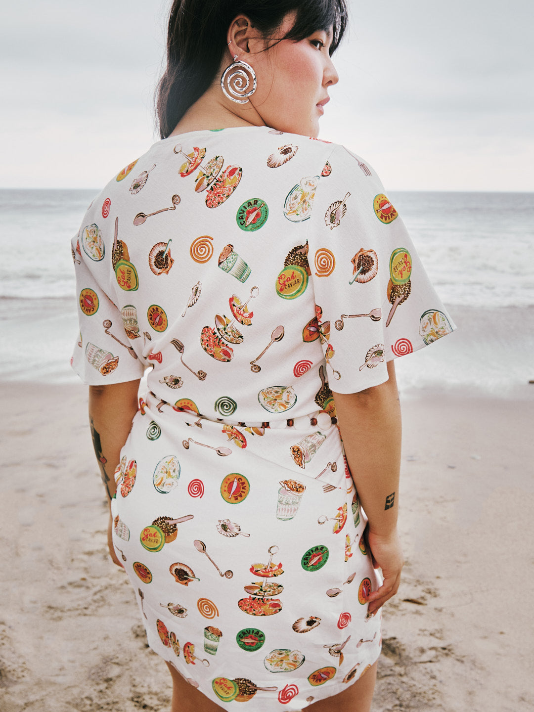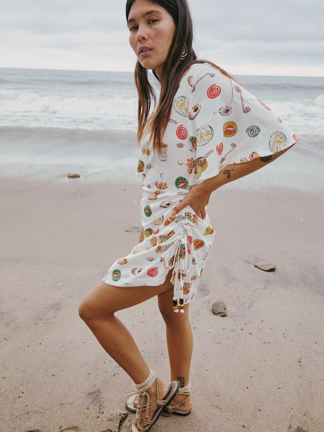 A mini dress with a round neckline and short bell sleeves. Featured in a lightweight linen blend in our signature Caviar Dreams print. This dress has an asymmetrical hem with a cinch at the left hip that includes wooden bead details and styling versatility.