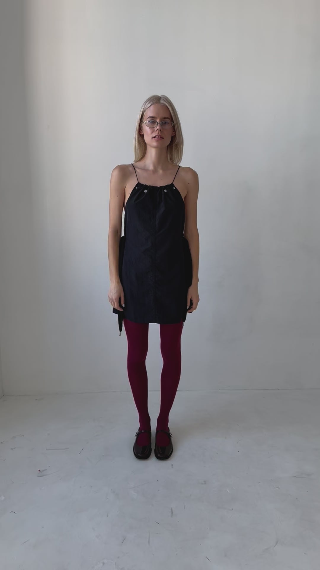 The Black Slow Dress by Zemeta is a sleek, black mini with an adjustable drawstring toggle for a custom fit. Ties at the sides let you cinch the waist for a flattering silhouette. Unlined for a lightweight, effortless feel—perfect for layering or wearing solo.