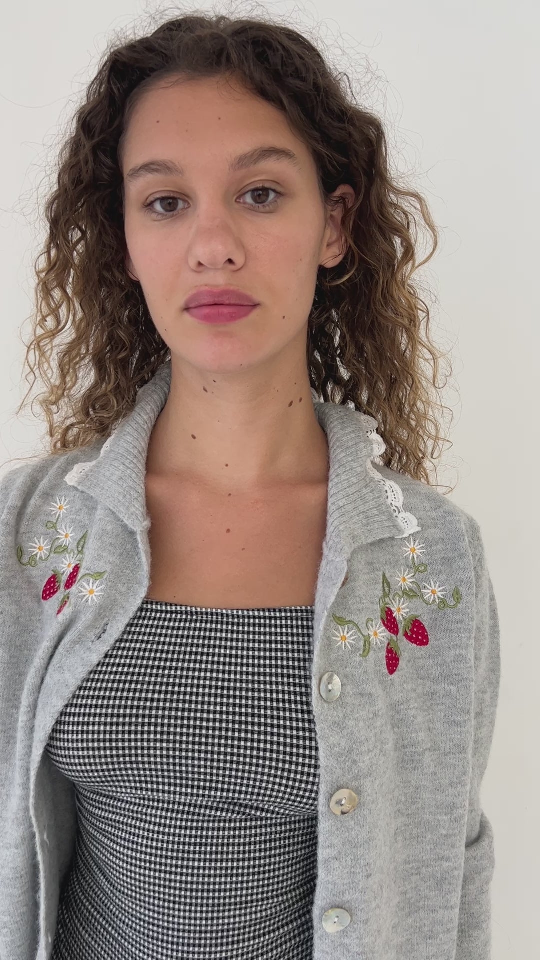 Slightly oversized soft cardigan with lace trim at the collar and strawberry embroidery.