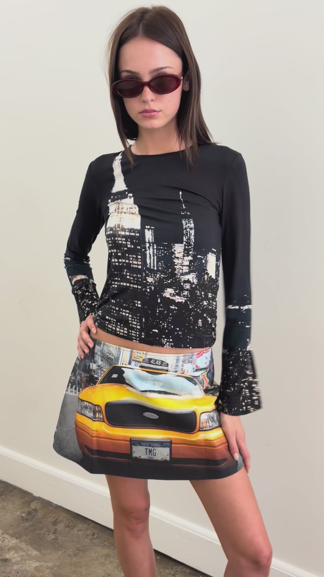 Introducing the Camilla Mini Skirt from Tyler McGillivary: This mini skirt is a nod to the city that never sleeps, the bold taxi design brings instant energy and personality to your look. With its flattering cut and fun, eye-catching pattern, this skirt is made for city strolls, nights out, and everywhere in between.