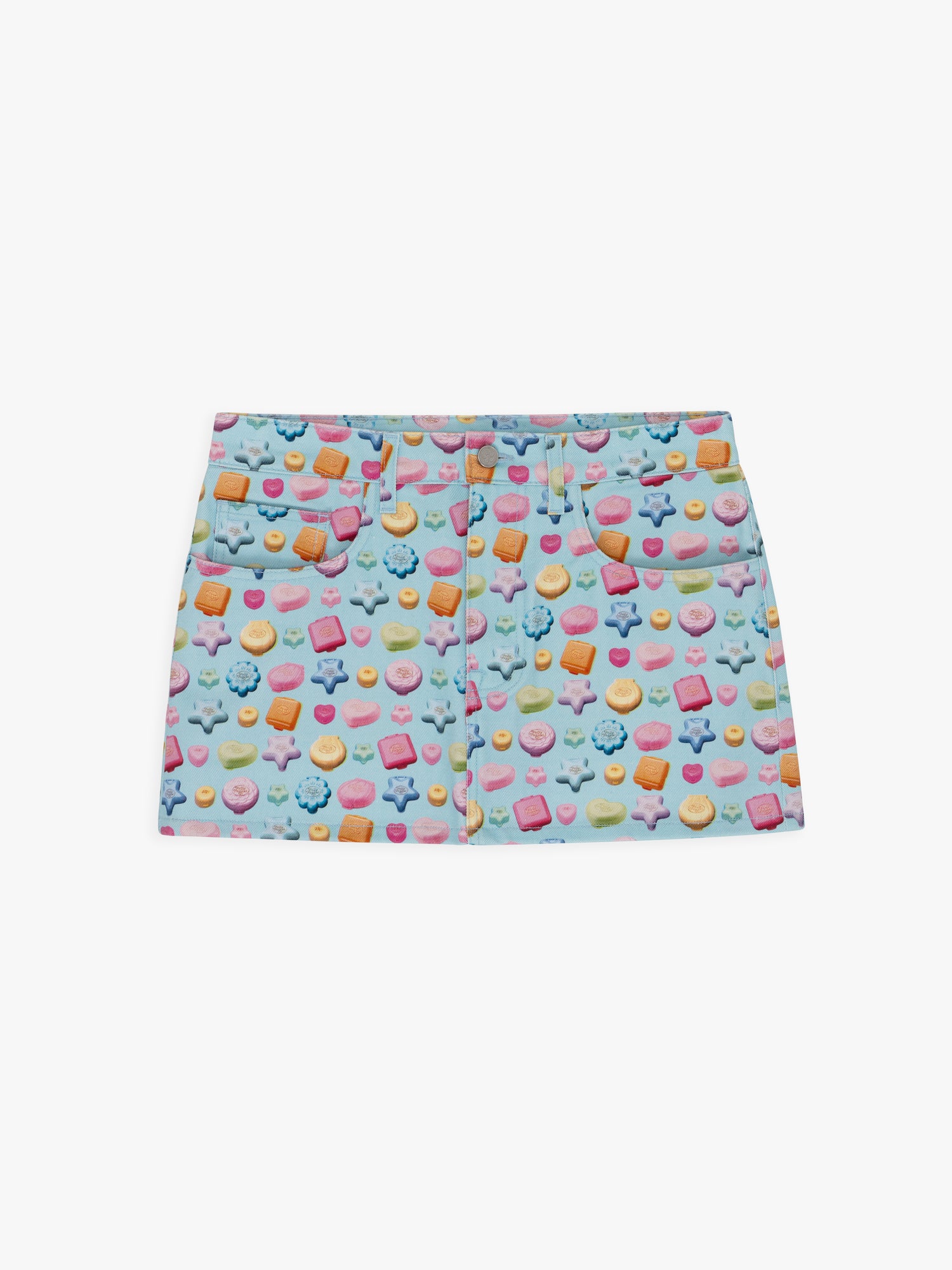 A mini denim skirt made in our signature Polly Pocket™ Nostalgia Print.