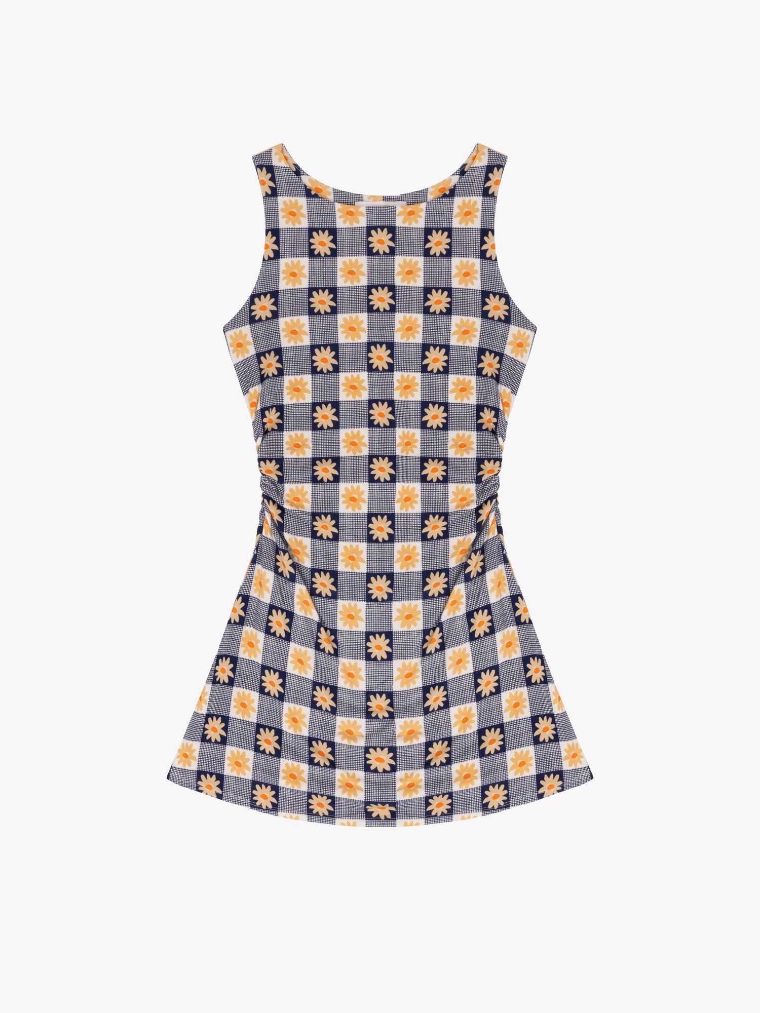 Mini dress featured in our signature Navy Daisy Gingham print and a boat neckline. This dress is knit and quite comfortable. Features a vertical elasticized waist for a cinched fit. This dress accounts for 2-3in of stretch all the way around.