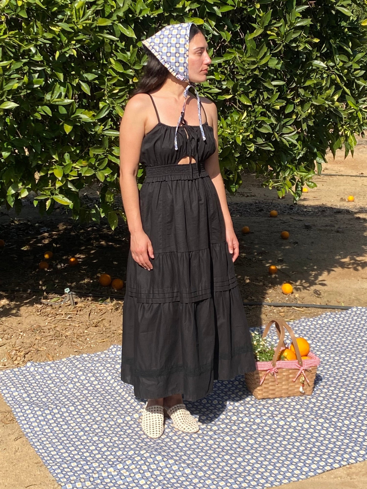 Cotton blend midi dress with a keyhole at front and an elasticated waist. This dress has adjustable spaghetti straps and features an tie at the bust for a versatile fit at the bust. This dress runs slightly big. We recommend sizing down by 1-2 sizes, depending on how you prefer the fit.
