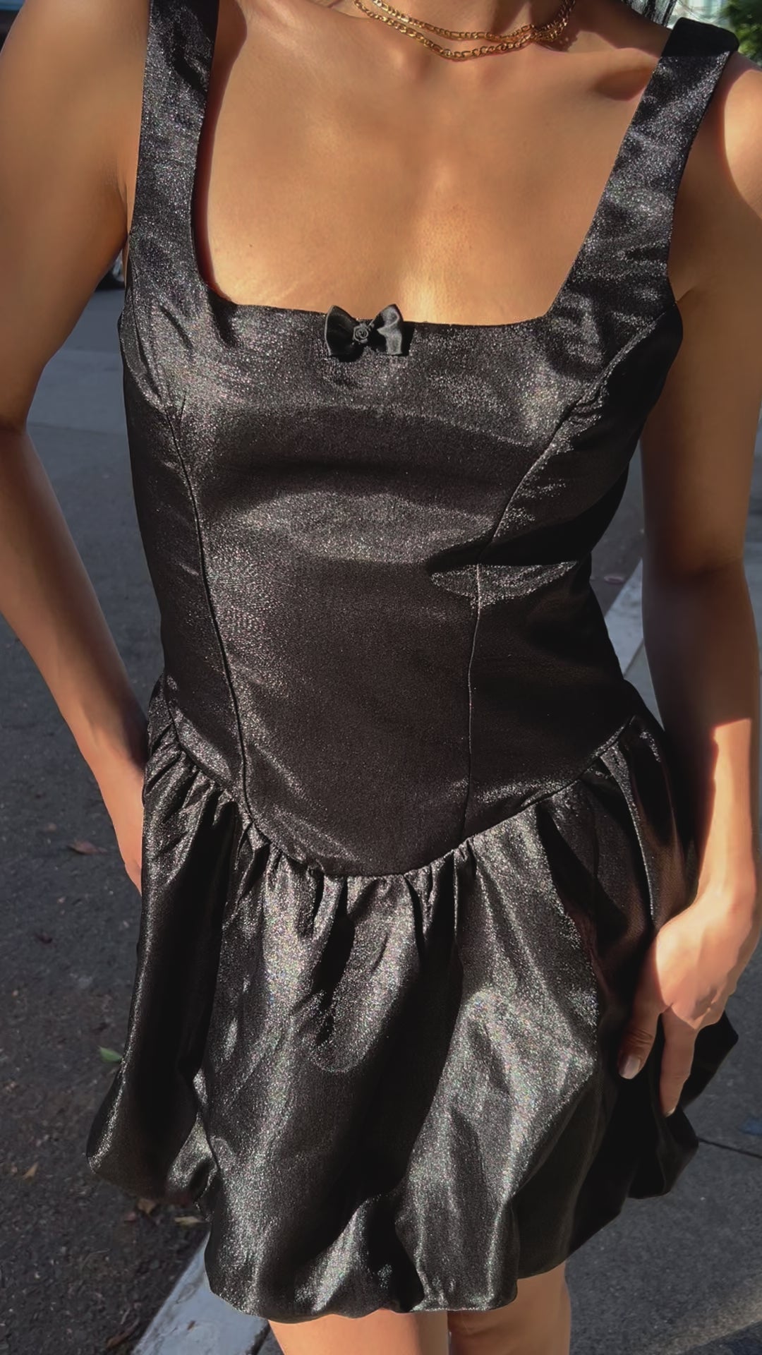 High-shine jacquard mini dress featuring a square neckline, bow trim and bubble hem. Fully lined.
