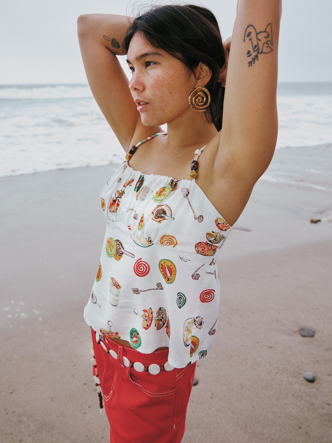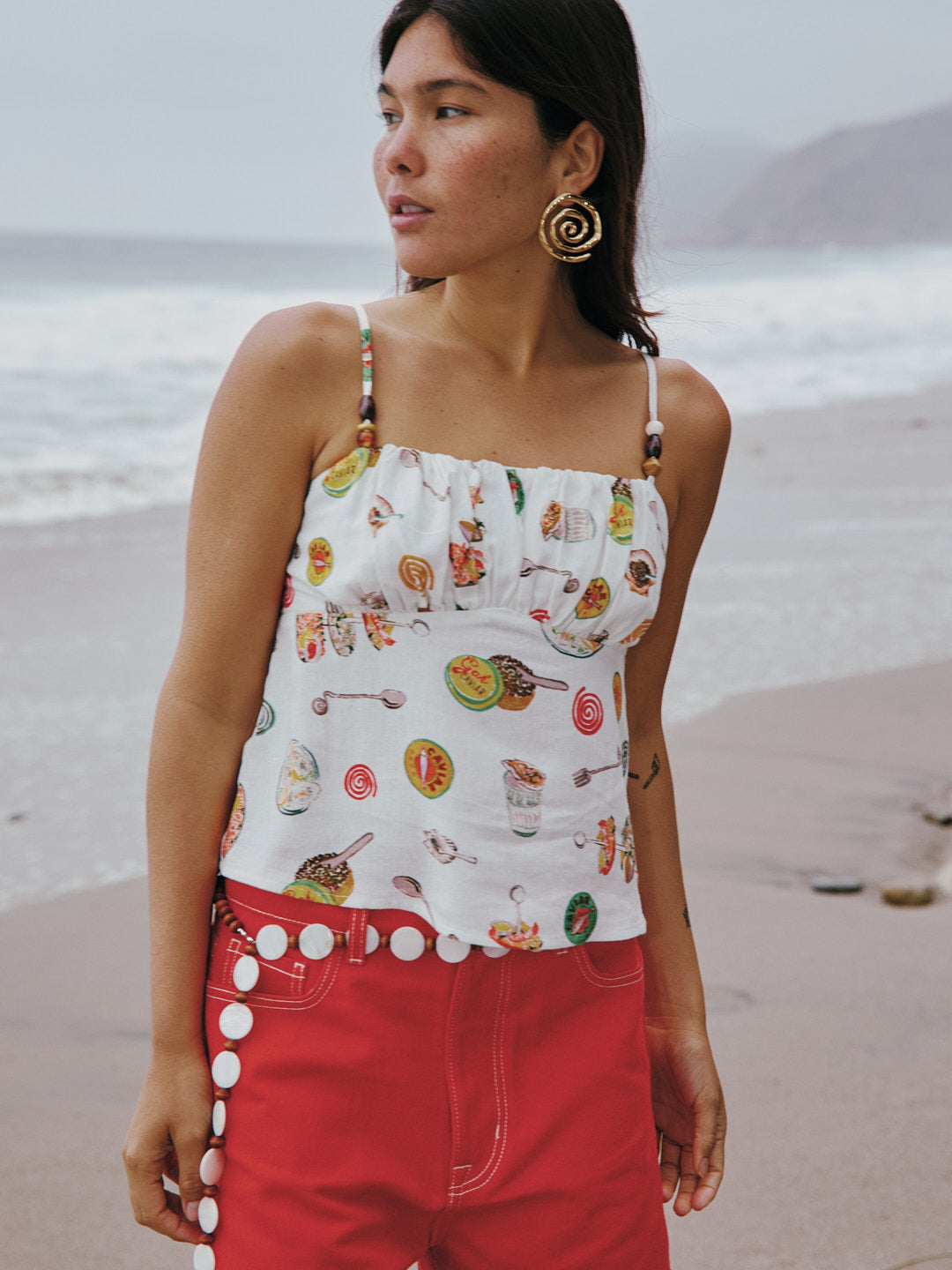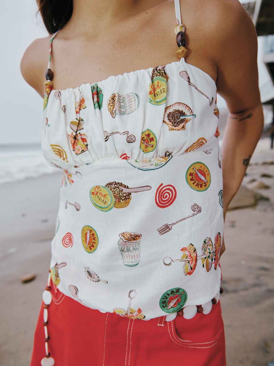 Lightweight linen blend tank featured in our signature Caviar Dreams print. This tank has spaghetti straps with wooden bead details and a ruched bust and a bodice that flares at the waist for a flattering fit.