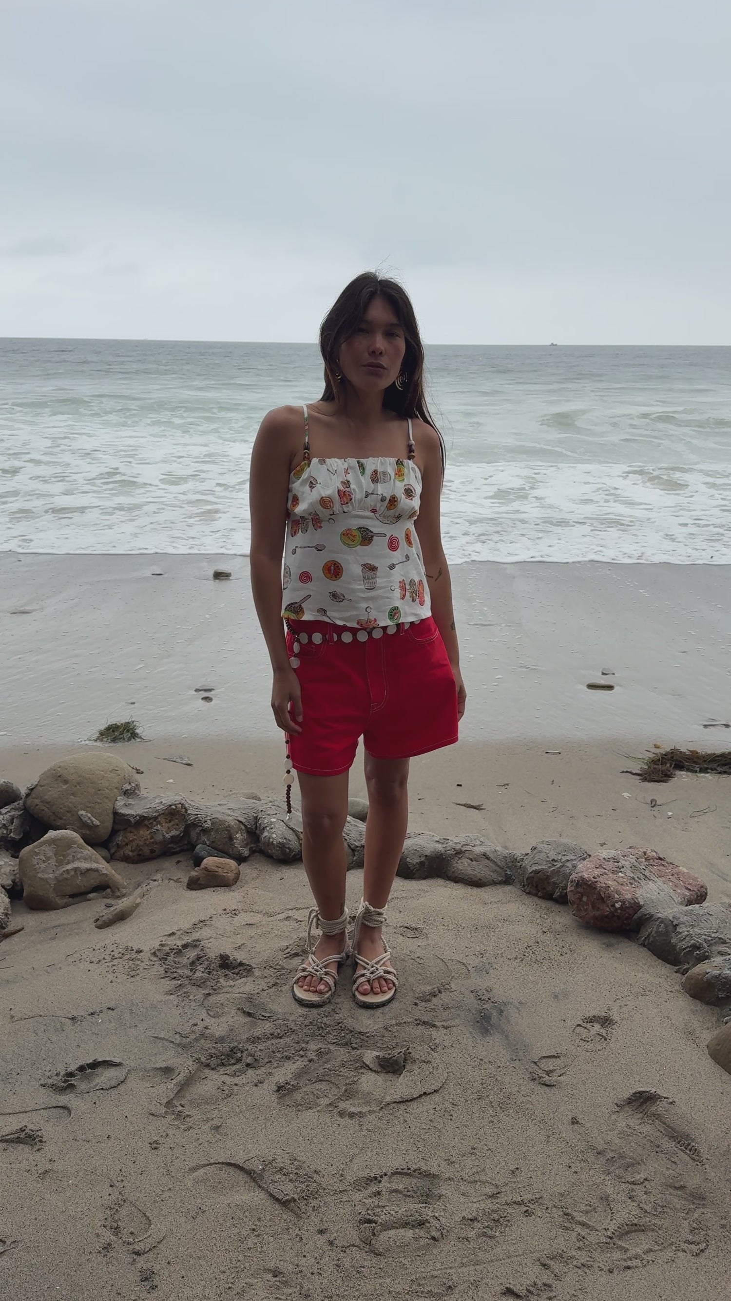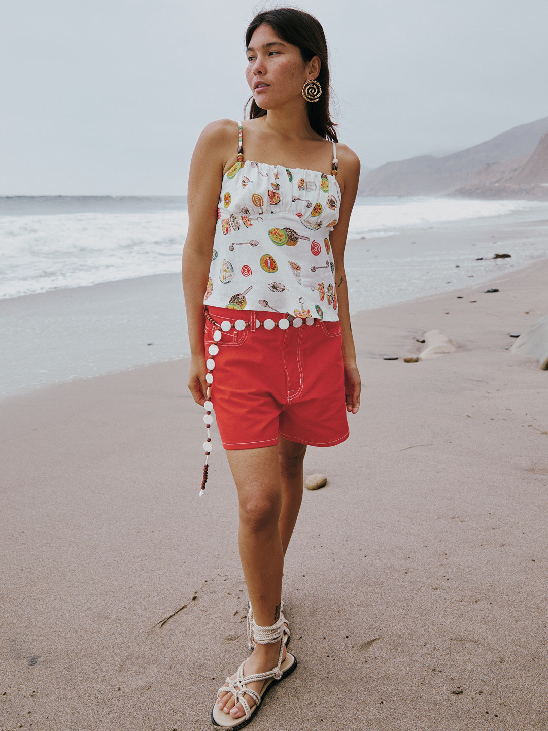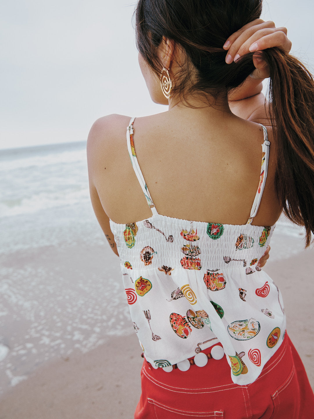 Lightweight linen blend tank featured in our signature Caviar Dreams print. This tank has spaghetti straps with wooden bead details and a ruched bust and a bodice that flares at the waist for a flattering fit.