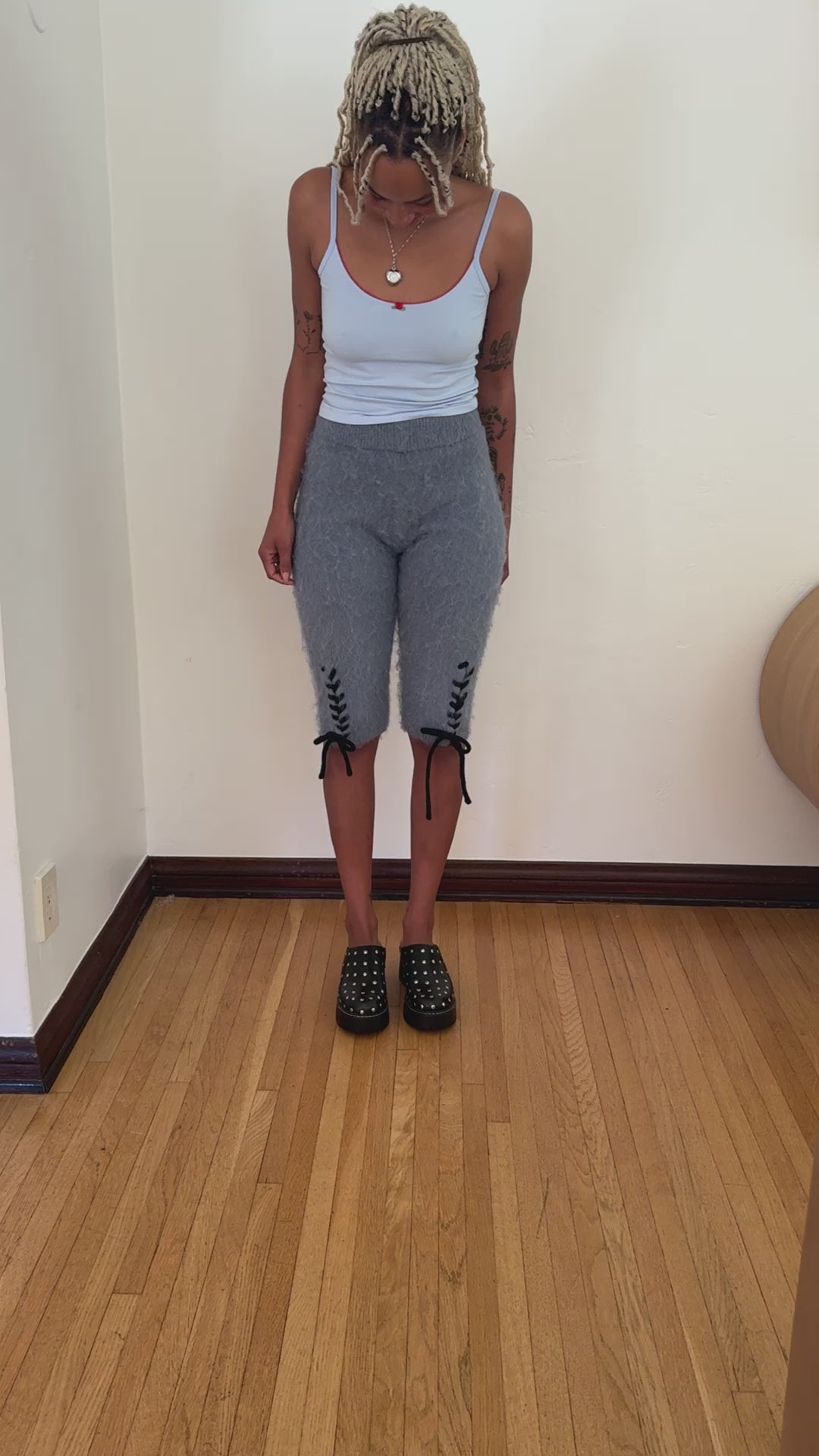 Fuzzy knit capri pants featuring decorative ties at the side hems.
