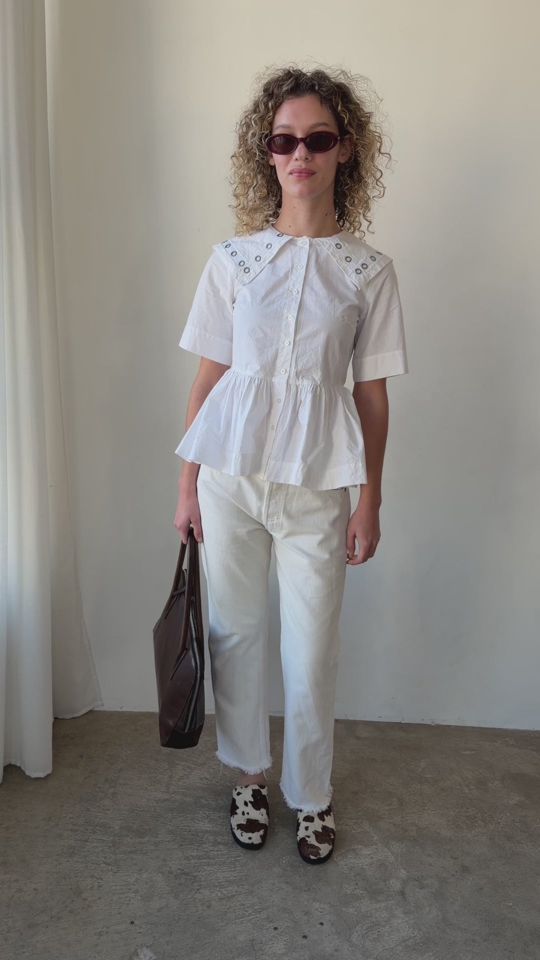 Meet The Cyrus Eyelet Blouse from Damson Madder. This blouse brings a playful yet polished edge to everyday dressing. Crafted from 100% organic cotton, it features metal eyelet details and an oversized collar, creating a standout silhouette that feels both classic and contemporary. Finished with a button-down front and a soft peplum hem.