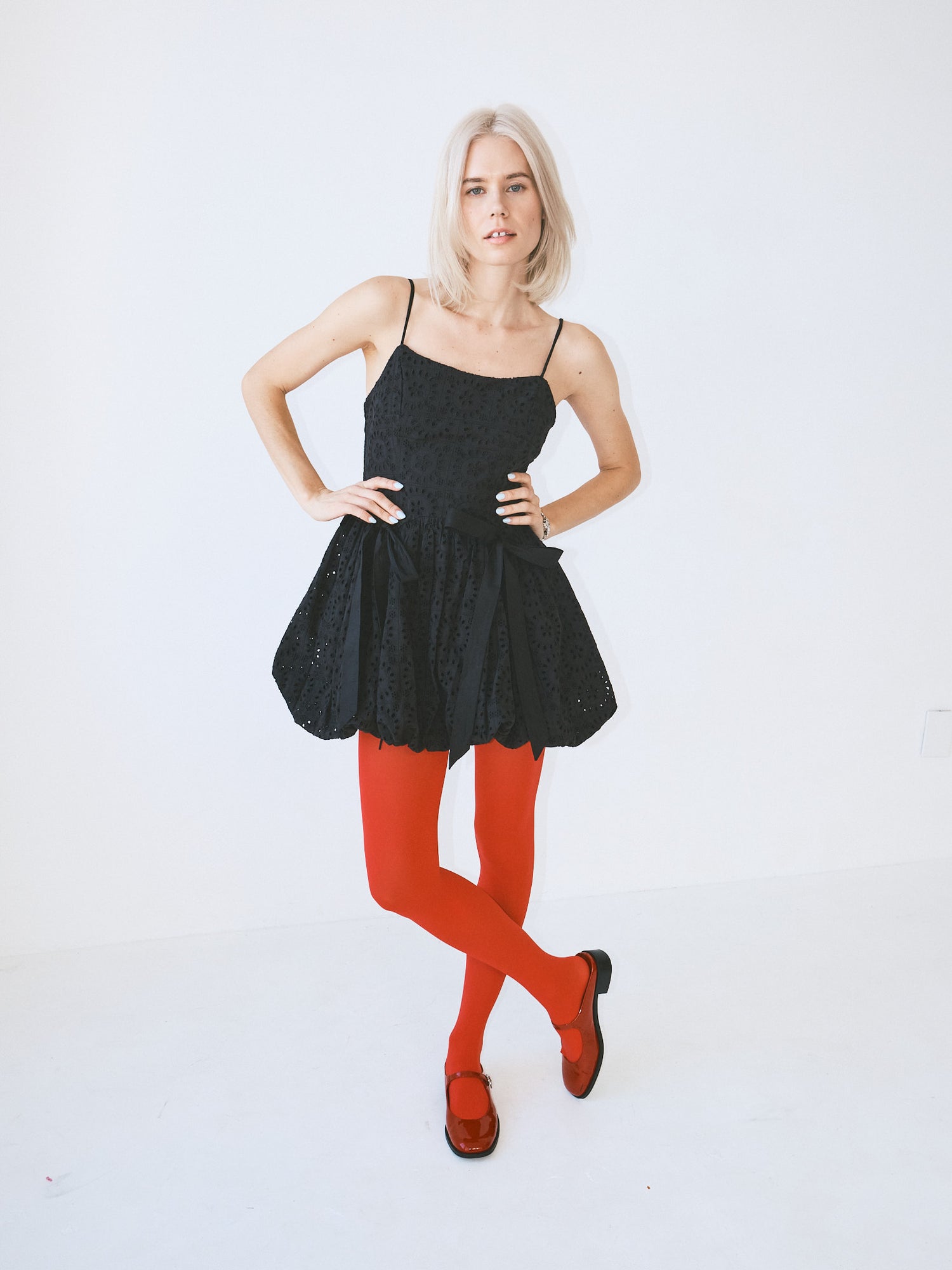 Be ready to flaunt your style in the Penelope Mini Dress - Black Broderie, a fun and flirty apron dress with a corset-inspired bodice, playful waist seam accents and adorable bow embellishments that perfectly gather into a full and flowy skirt.
