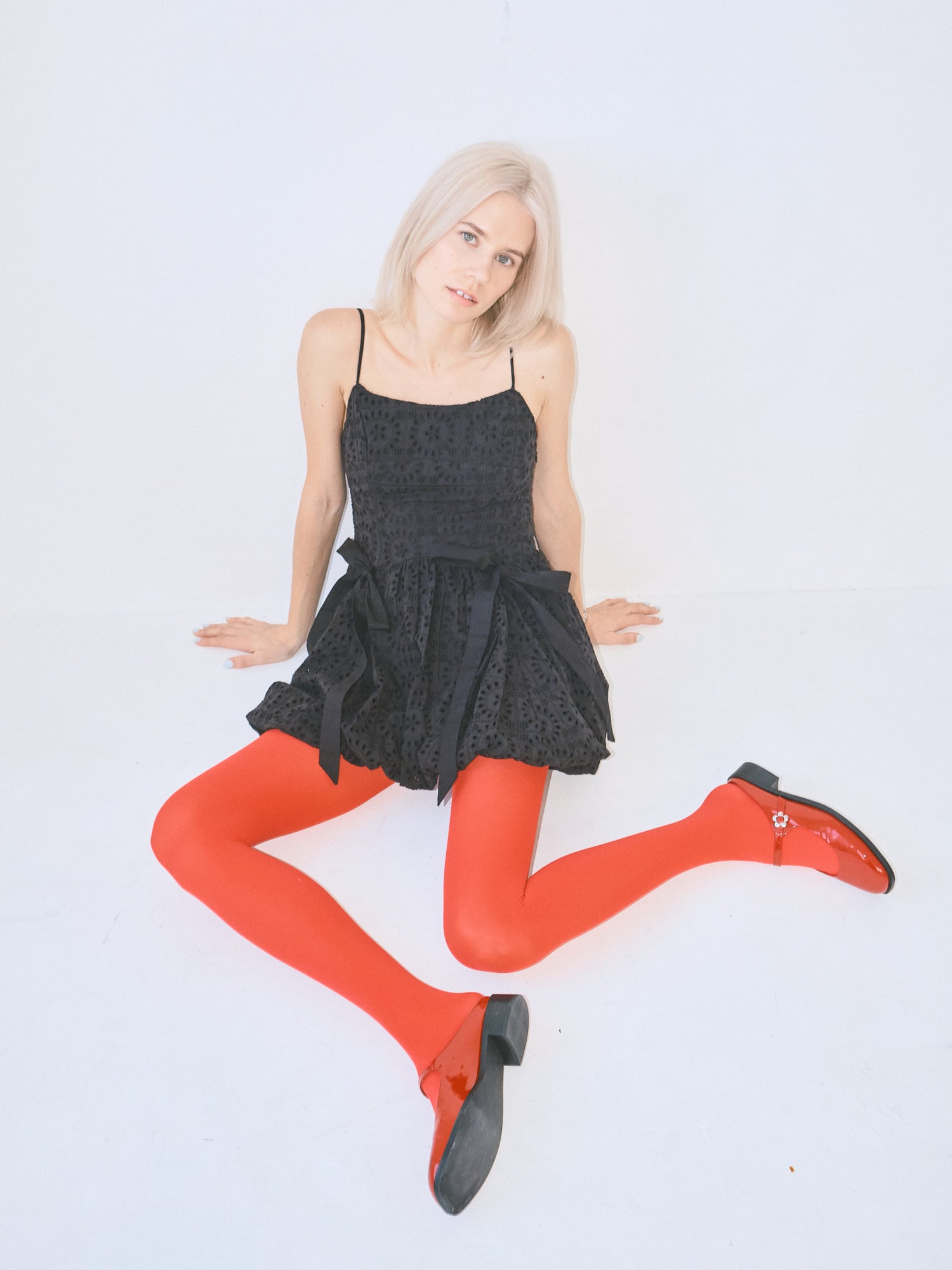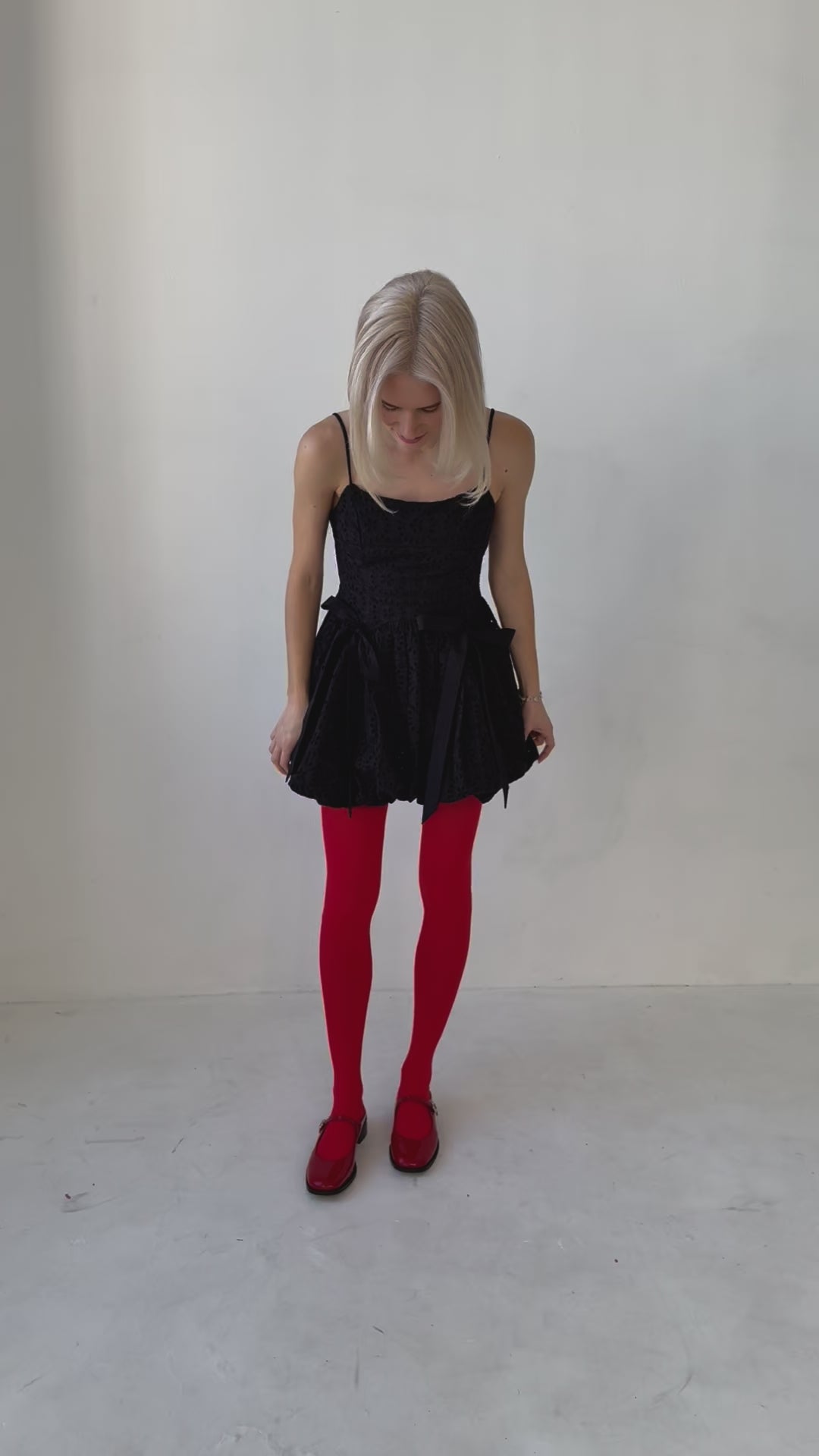 The Penelope apron dress is a black broderie mini dress featuring a corset style bodice with waist seam details and bows that gather into a fuller skirt.