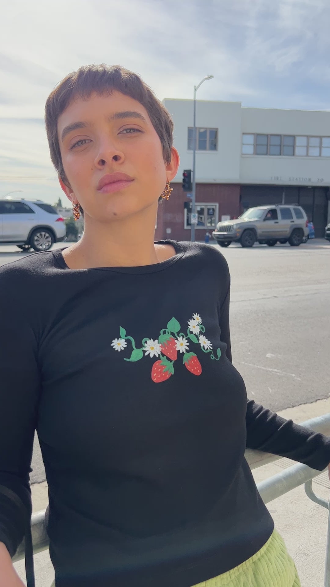 🍓Gah! The Dana is such a closet staple. A fitted cotton long sleeve tee with a cropped body and the most adorable strawberry print at the chest. Made from deadstock rib fabric sourced locally in LA.