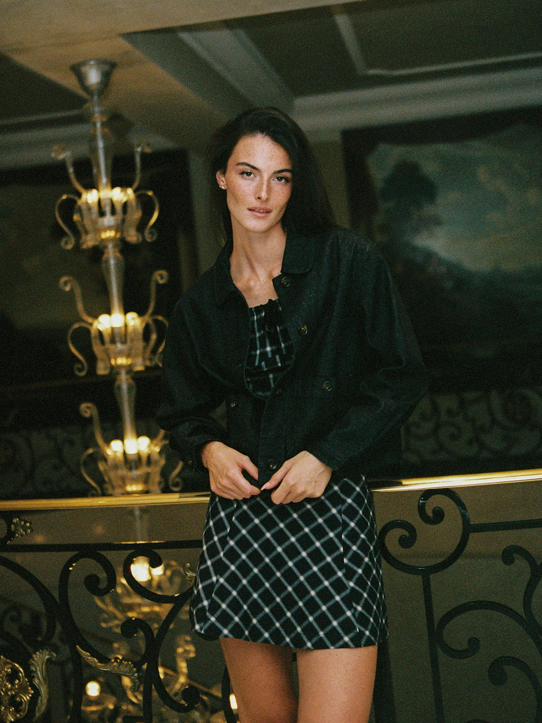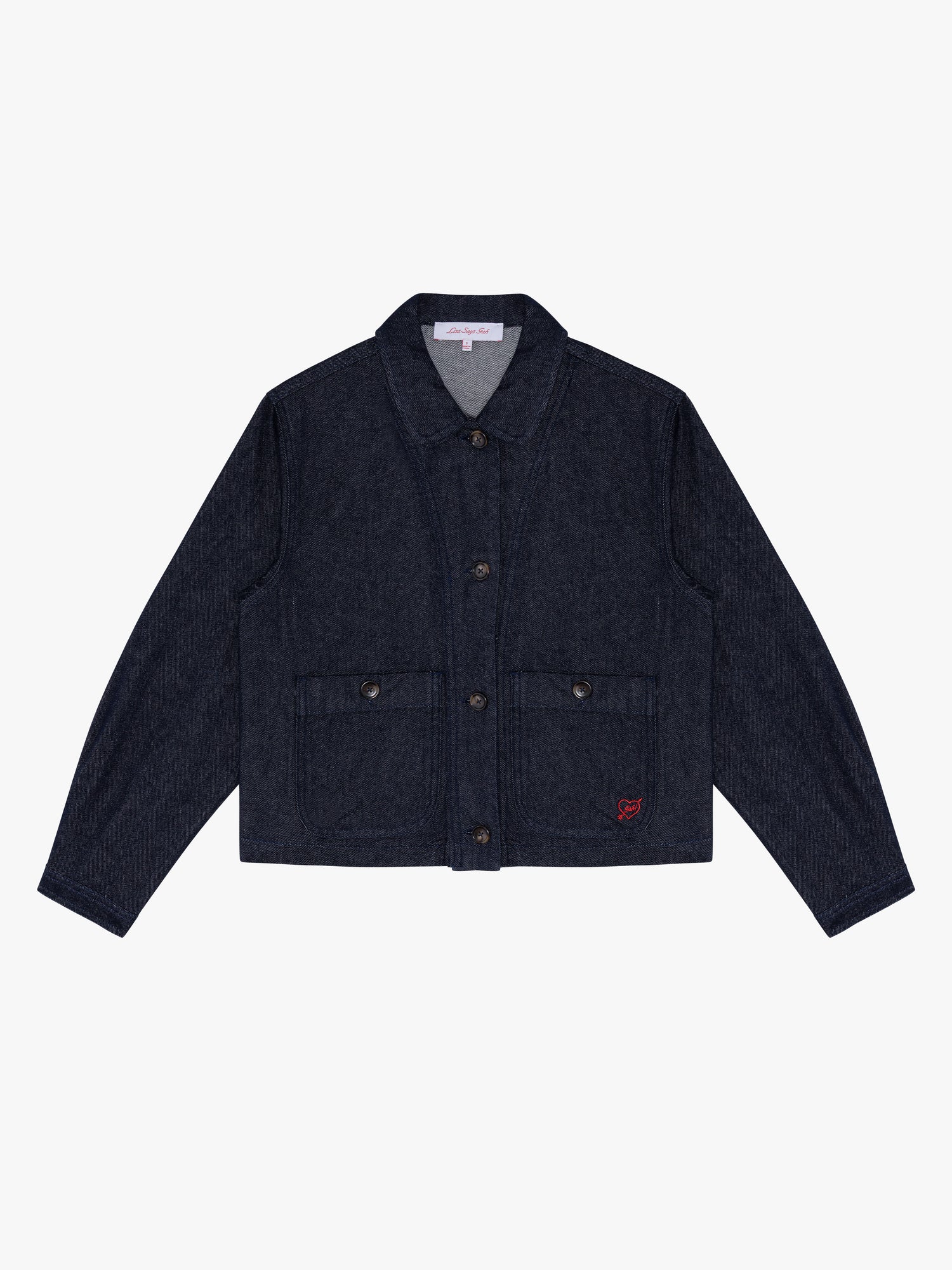 Introducing the Daphne Jacket — made from soft cotton for ultimate comfort. This dark denim jacket is inspired by a french chore jacket. Perfect for any occasion and there when you're ready for fall. Featuring pockets at the front with our signature 'Gah!' embroidery and a button closure.