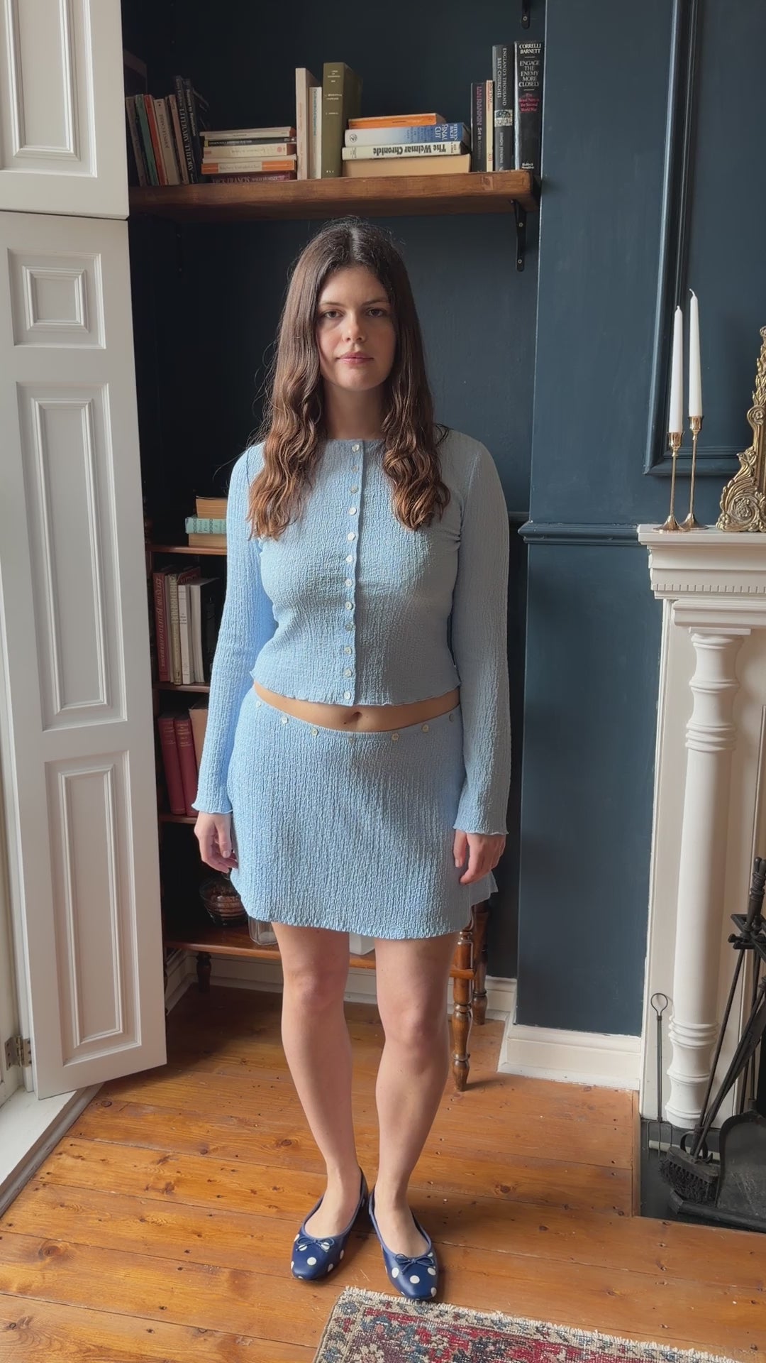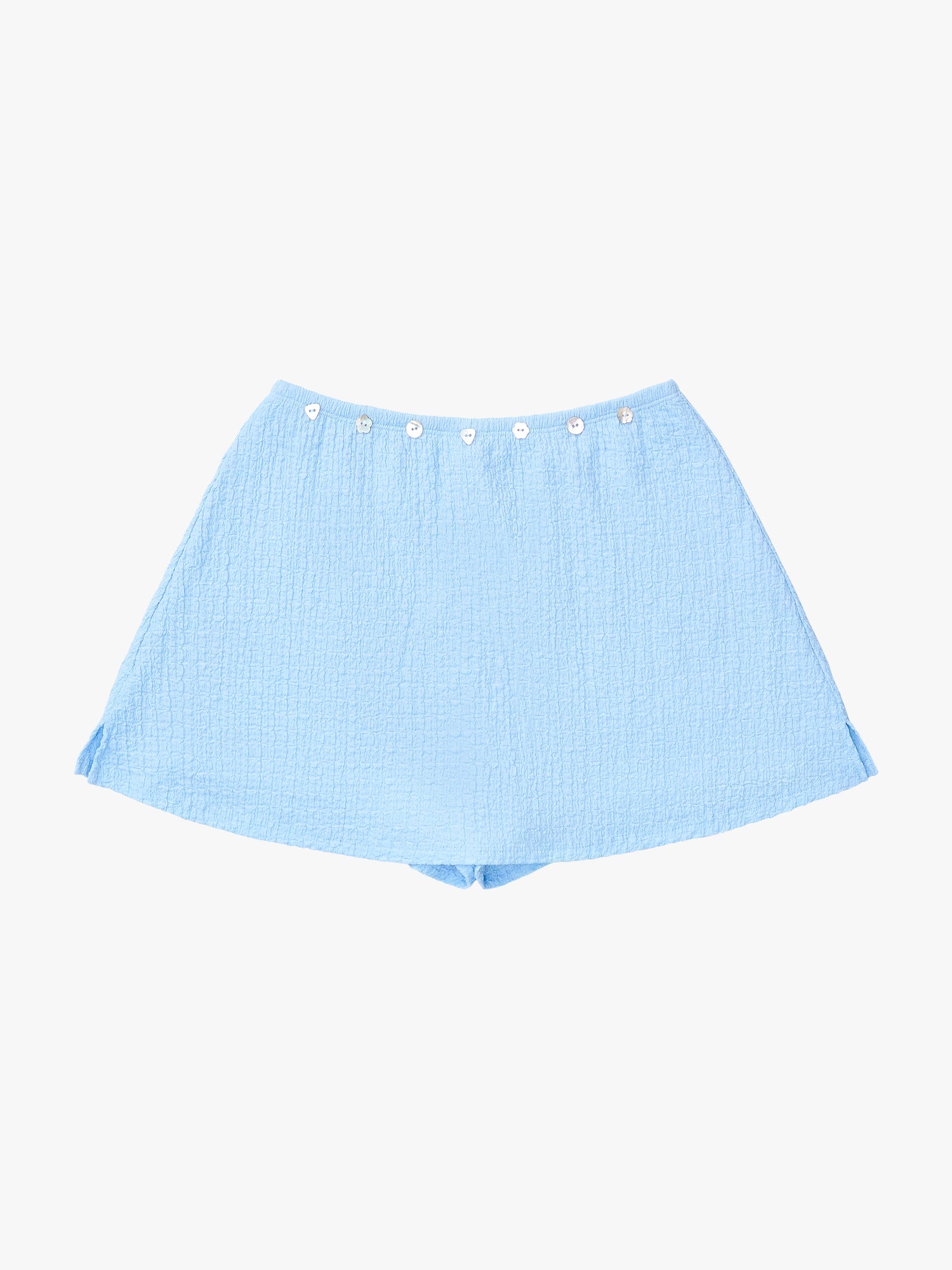 The Darcy Skort is a best selling mini skirt with a built in short. The high waisted skort is made with an elastic waistband and stretchy material for comfort and ease. Featured in our signature powder crinkle fabric and a shell button detail at the waist.