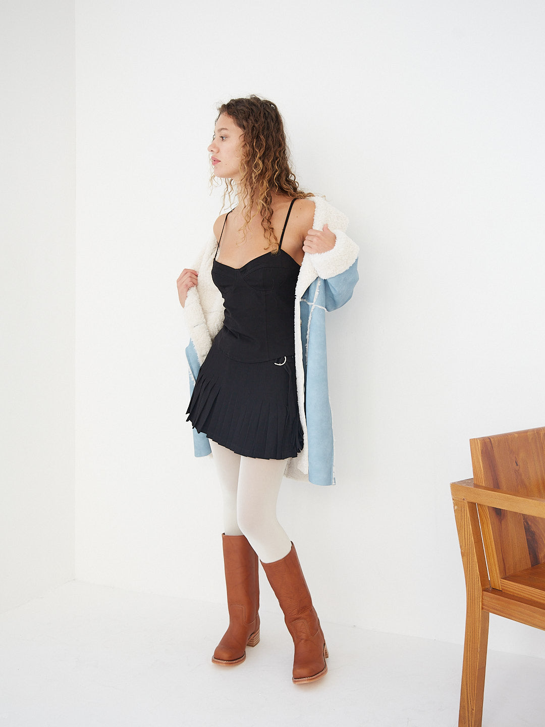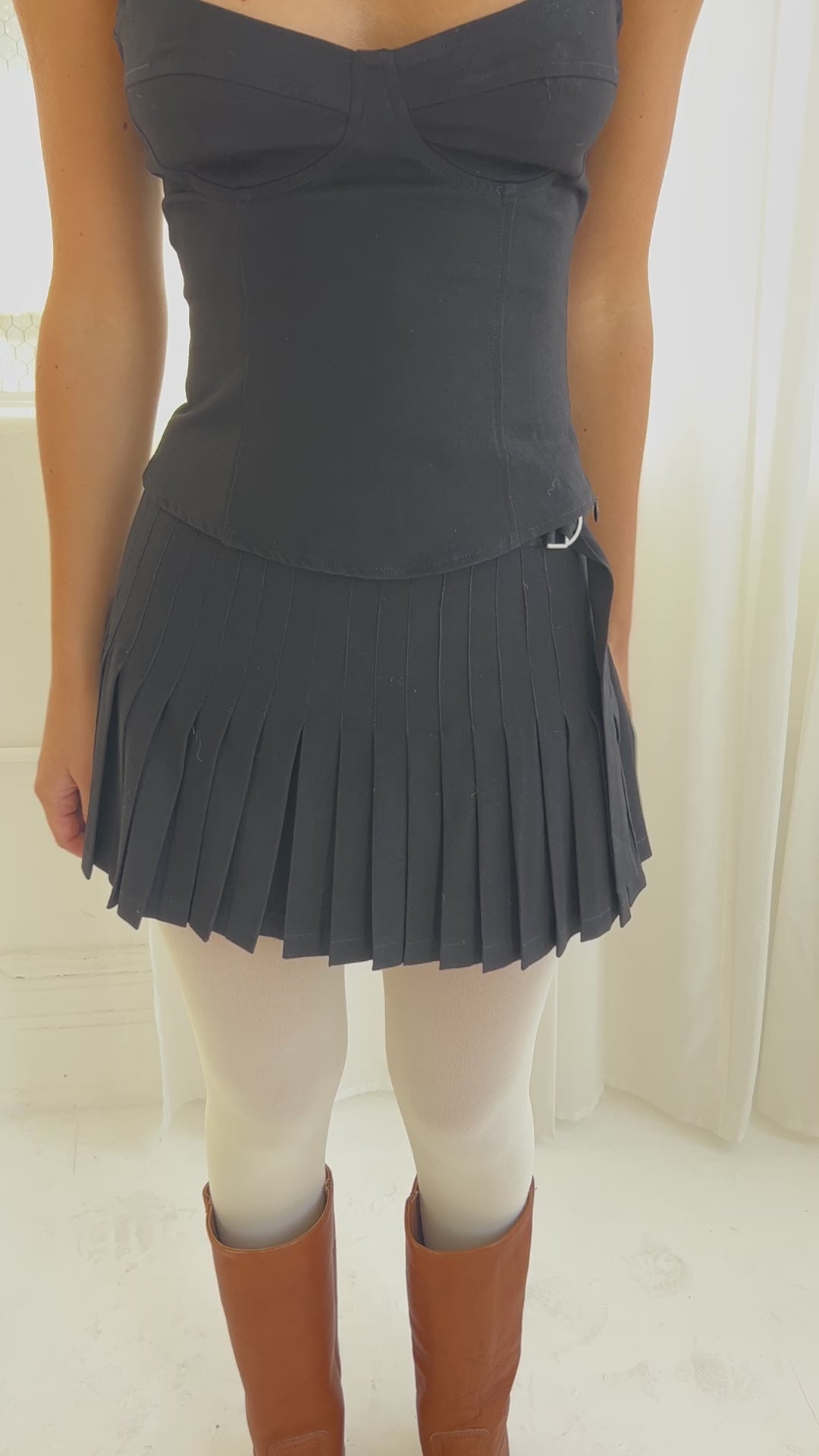 Mid-rise wrap ultra mini skirt with built in shorts featuring mini pleat details and D-ring closure.