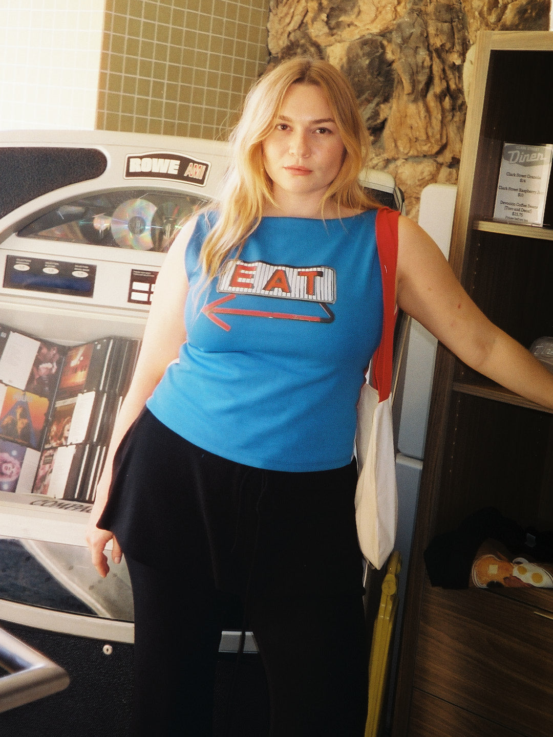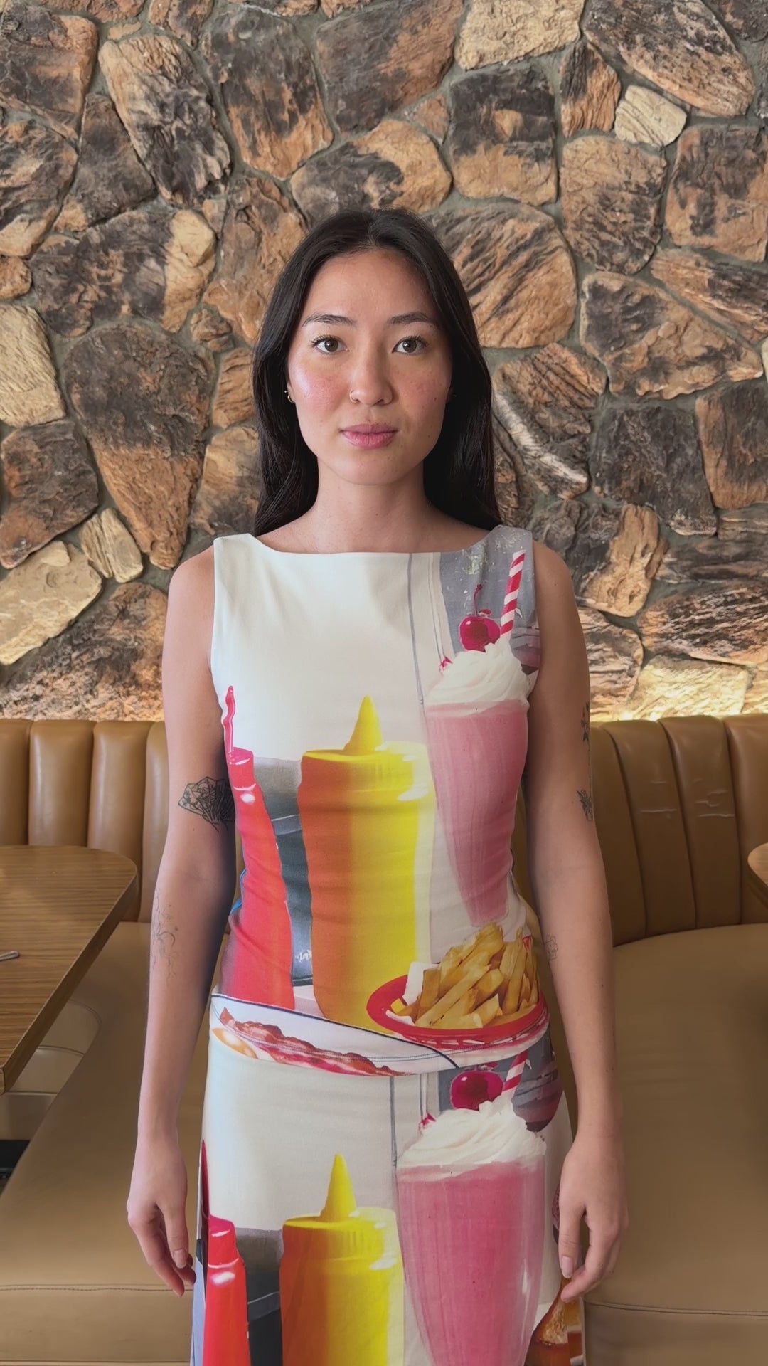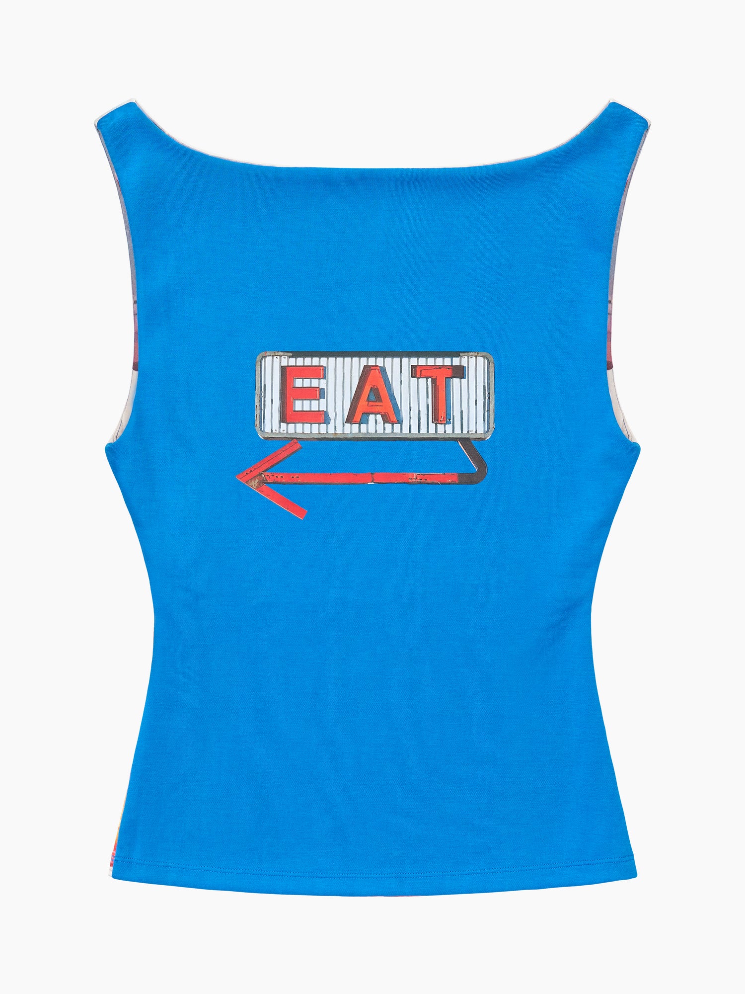 Introducing the Dottie Tank: A picture perfect diner print with classic American favorites. The most comforting sunny print to take you from breakfast to late nights. Reversible with a contrast blue side. Featuring a signature flattering boat neck and cut in a soft, breathable cotton jersey.
