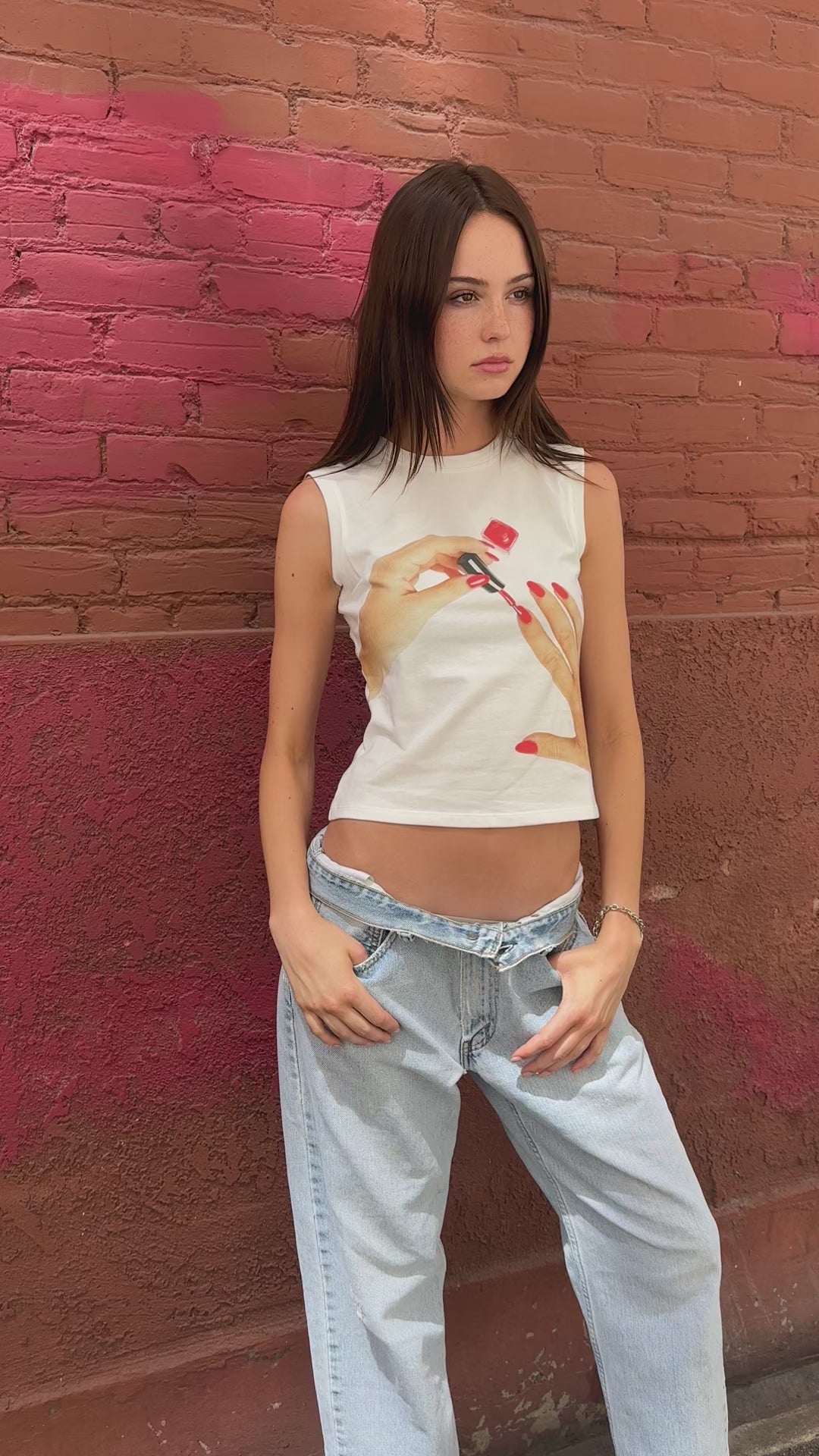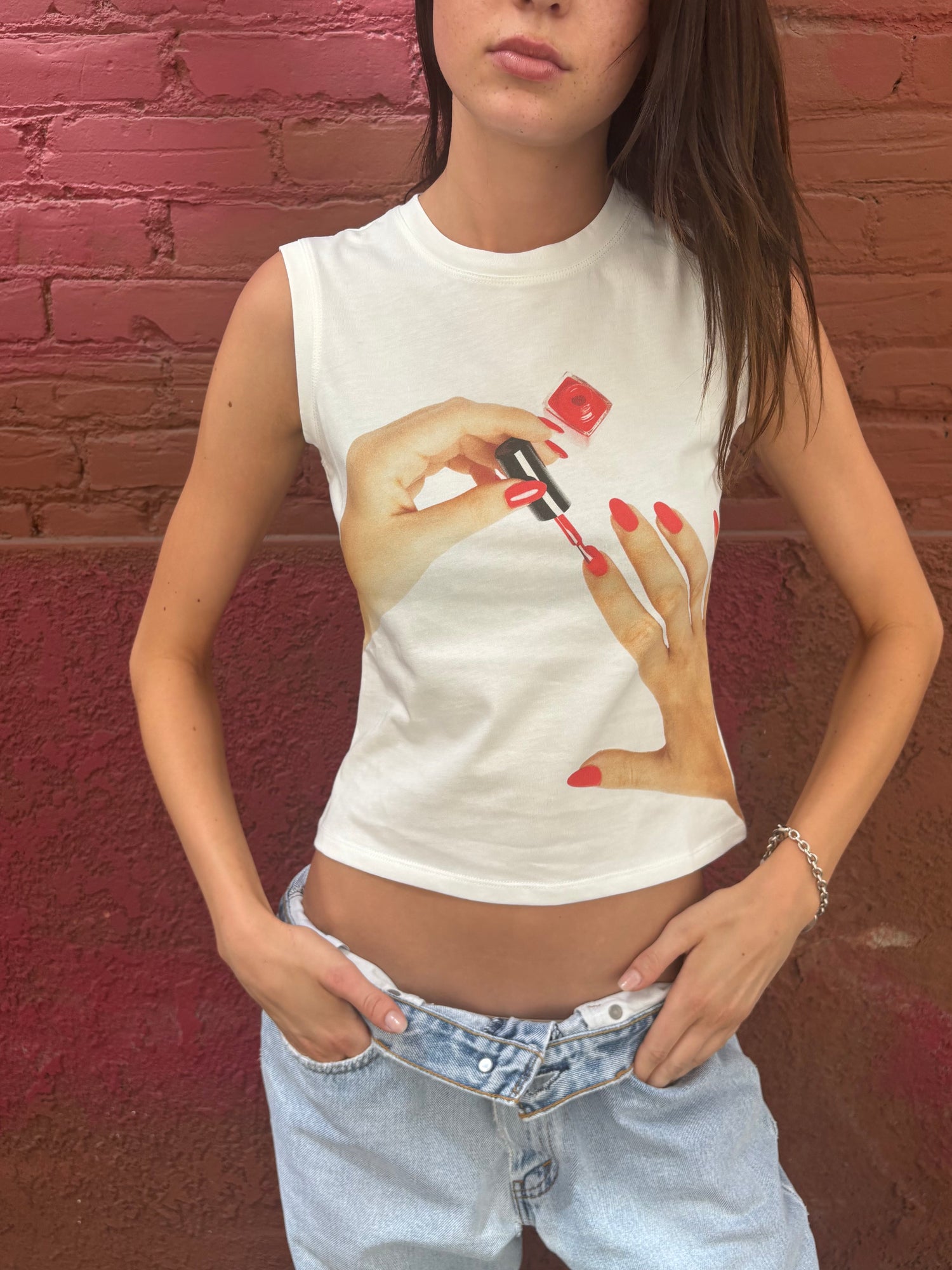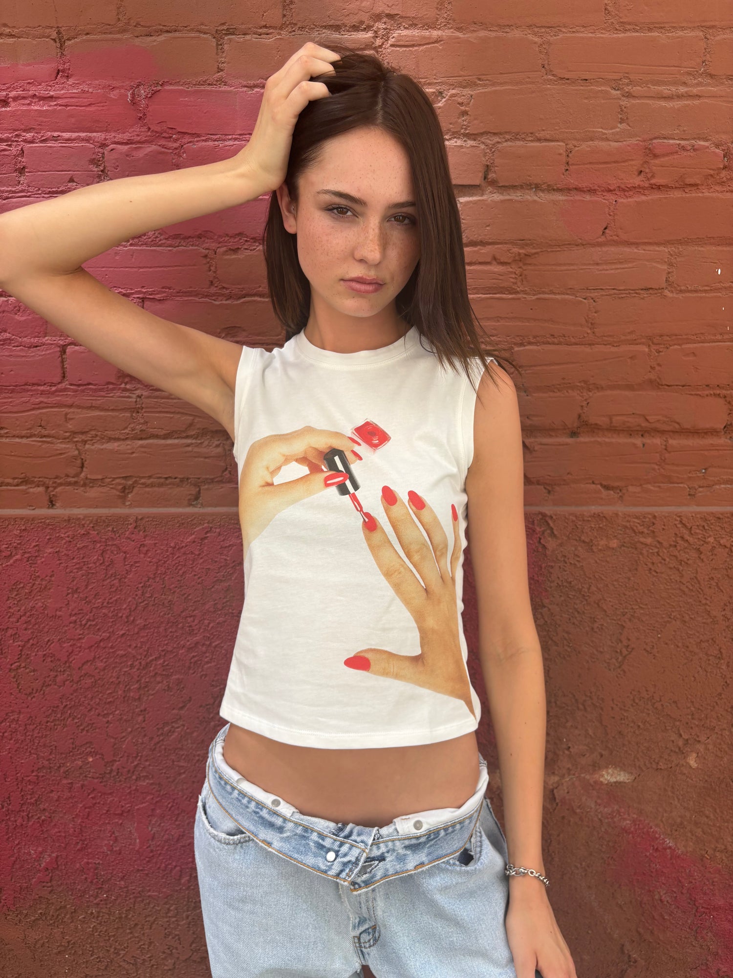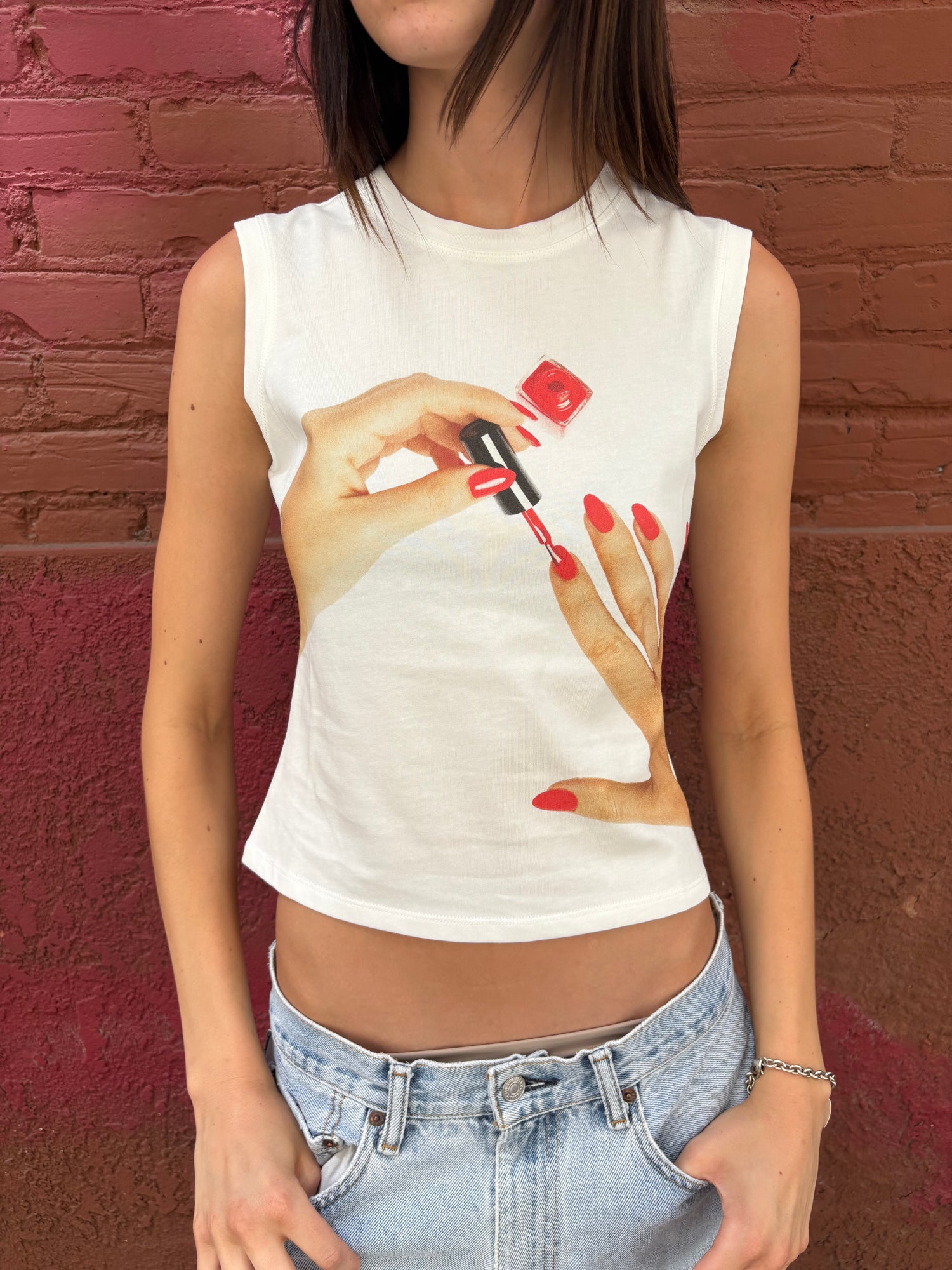 The Dover Tank from Tyler McGillivary is an ivory tank featuring a fun nail polish print at the front. Featured in 100% cotton, this tank will make you dream of the salon. We recommend sizing down for a more snug fit.
