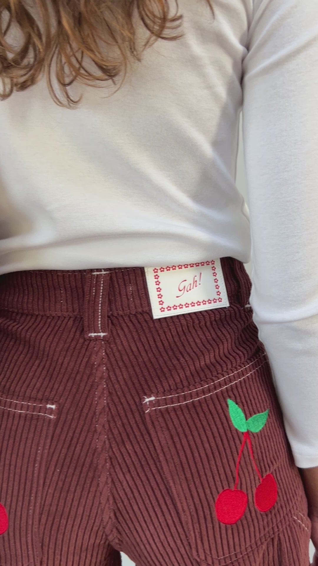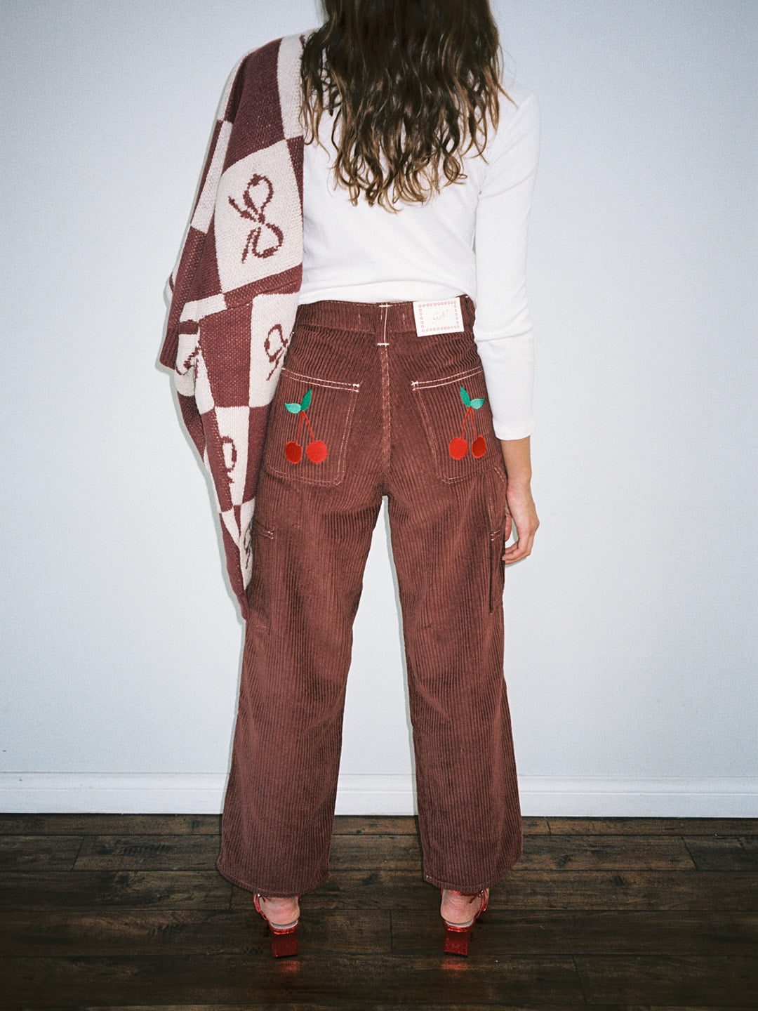 High-rise, rigid, non-stretch jeans in a brown corduroy fabric with carpenter jean details featuring embroidered cherries on the back pockets.