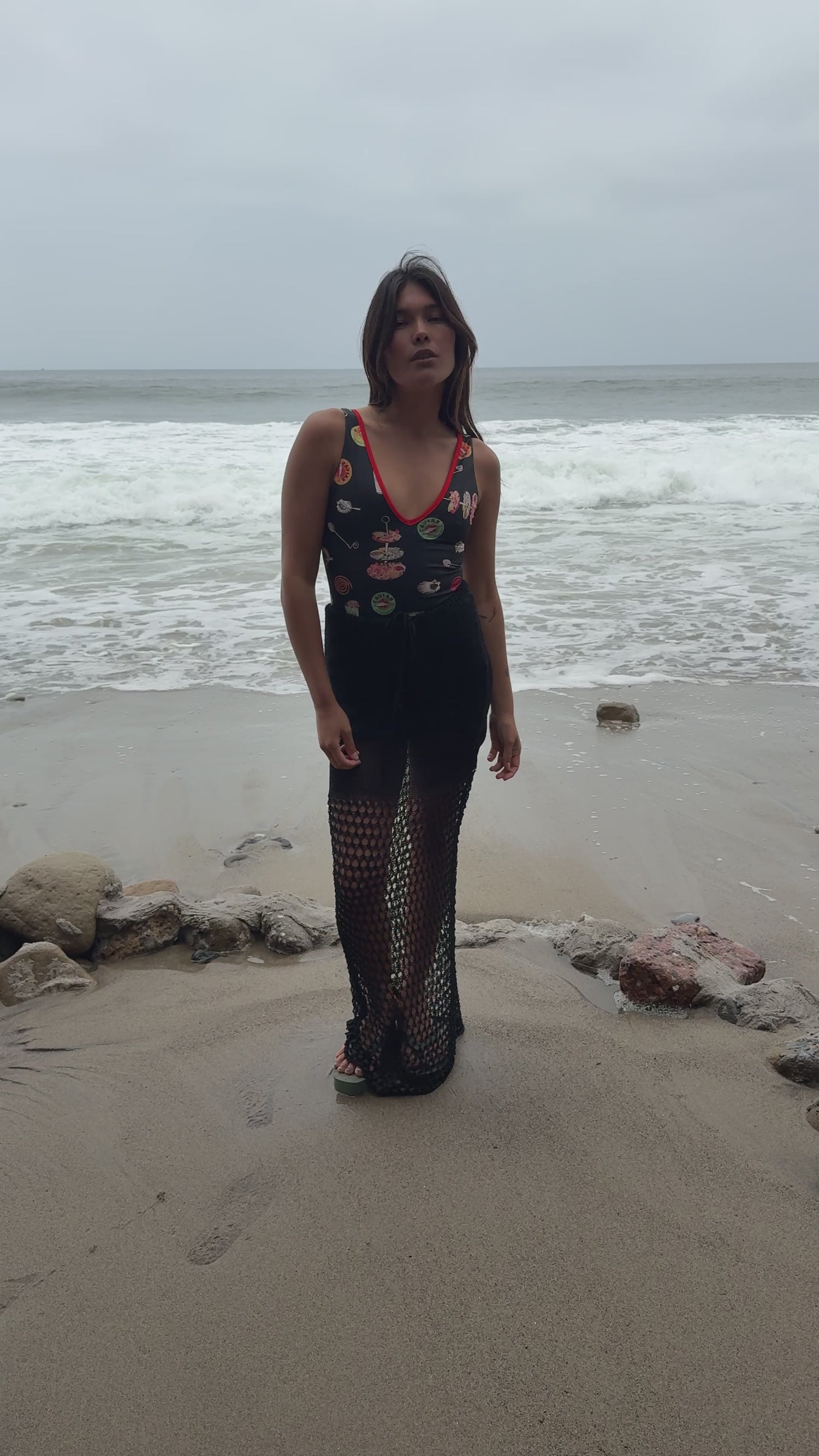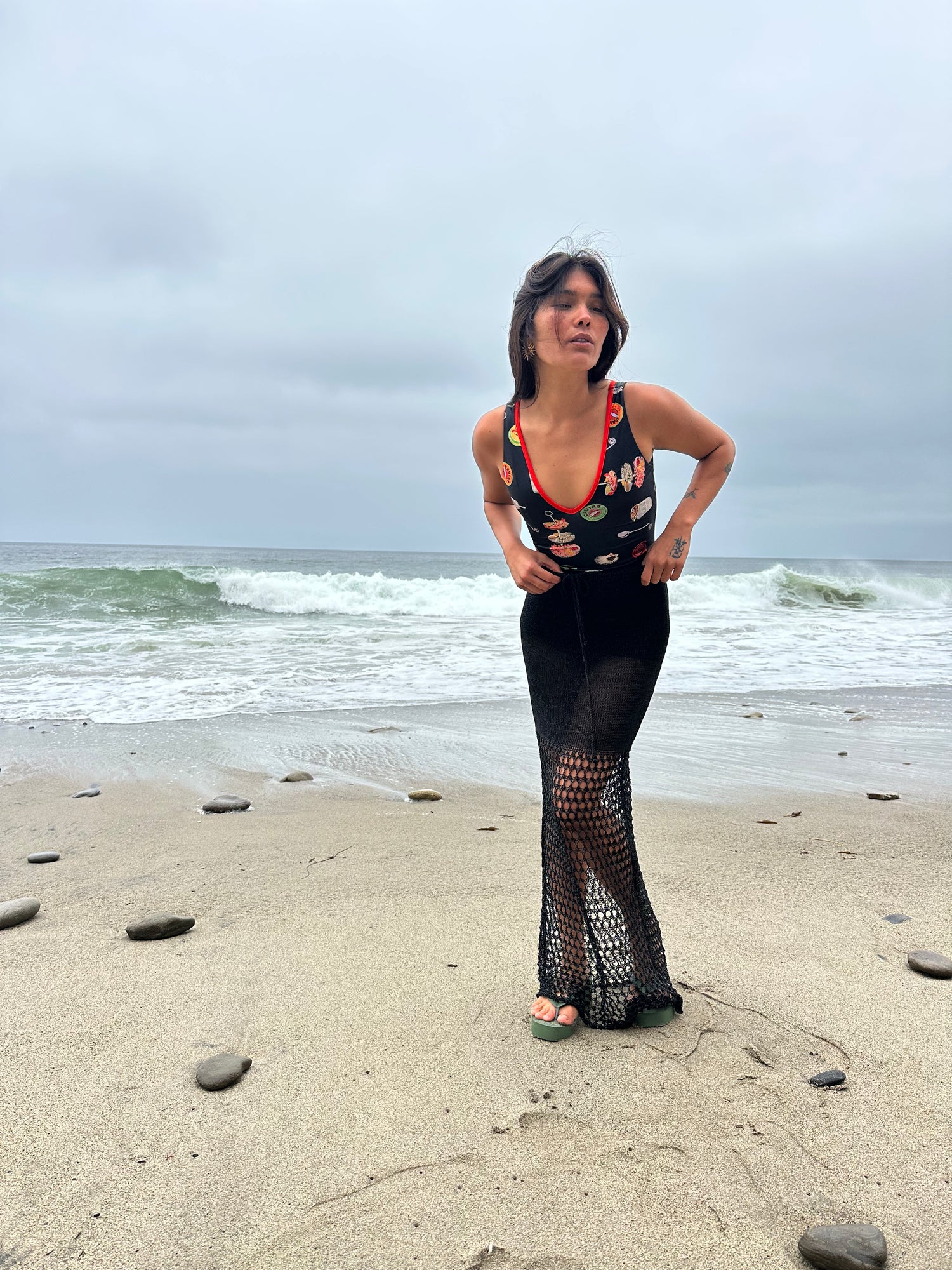 Black Skirt with open-knit design and drawstring. This skirt begins with a dense knit at the waist for added coverage.