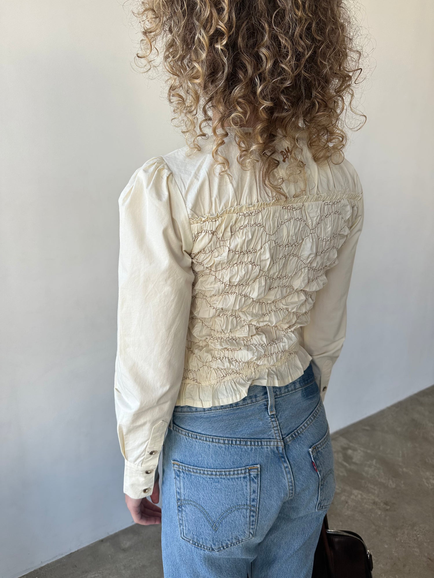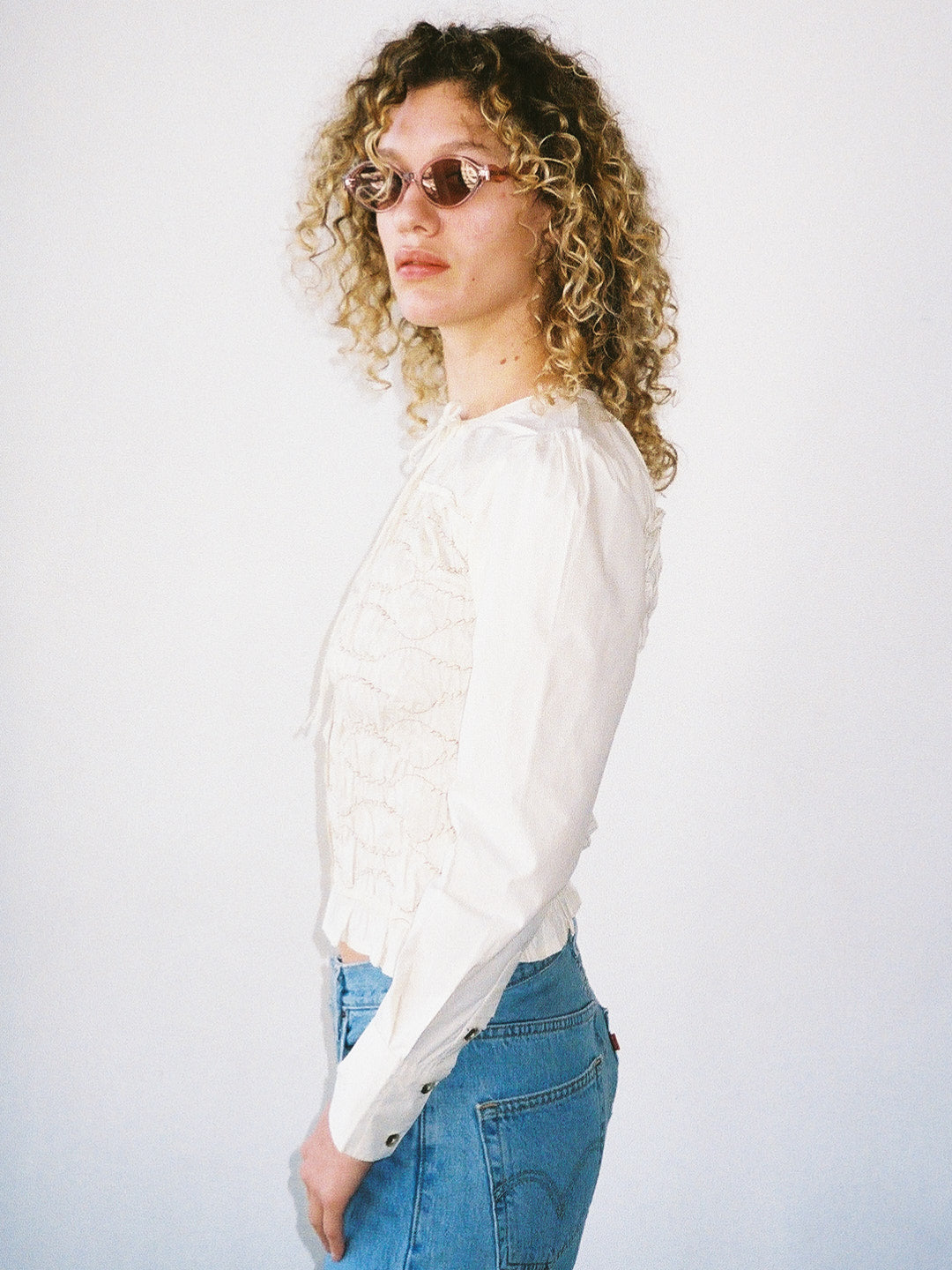 Meet The Elliana Smocked Cardi from Damson Madder. Crafted from 100% organic cotton, this blouse features a beautifully smocked bodice that creates a flattering, fitted silhouette. A soft crew neck is finished with a delicate tie detail, while a full button-down placket and cuff buttons add refined structure.