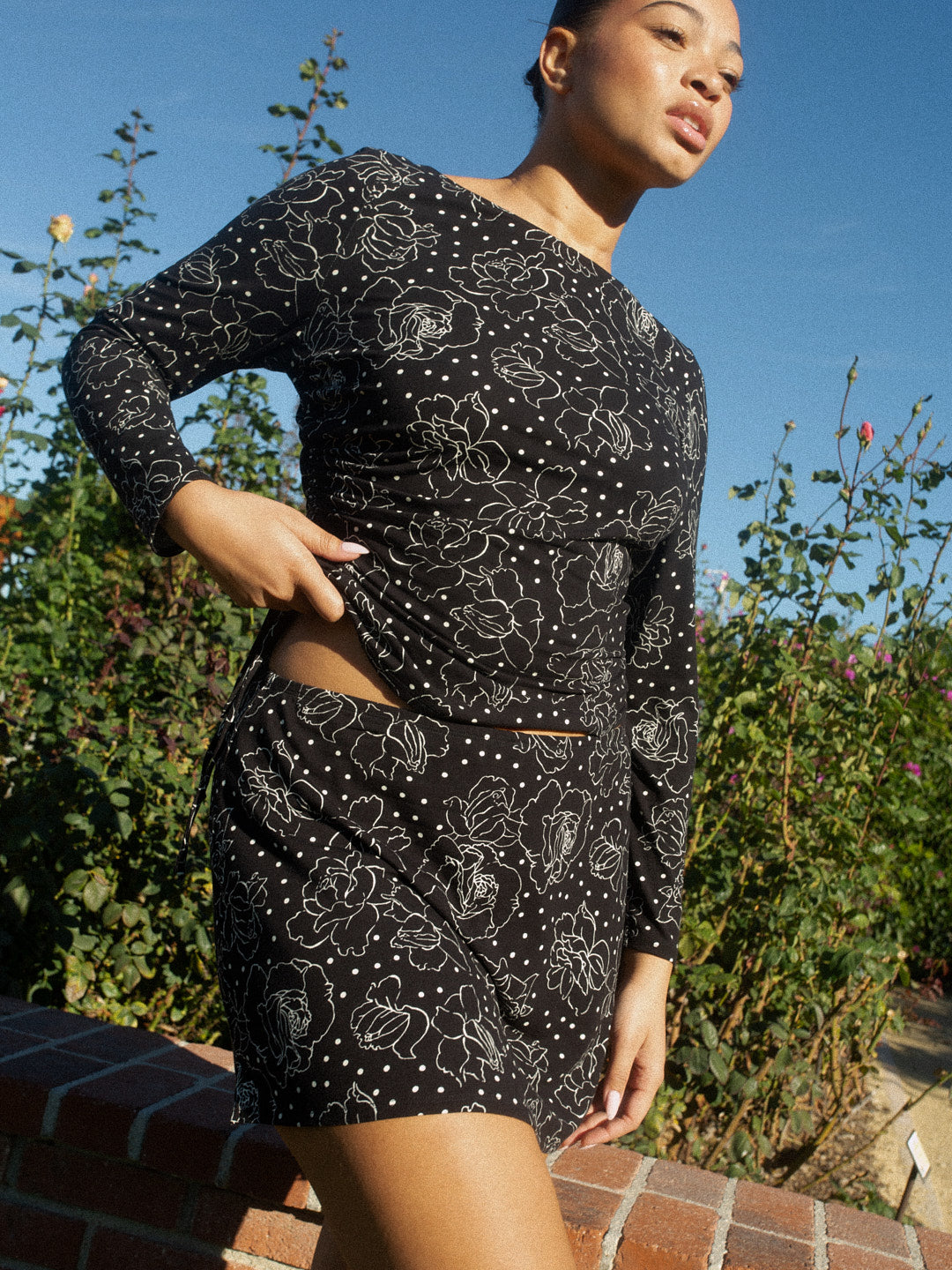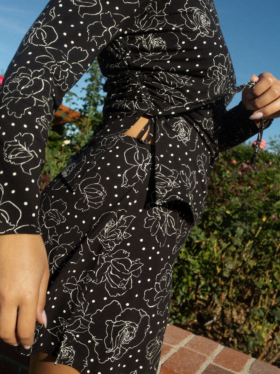 The Emma Long Sleeve Top is a form fitting, long sleeve blouse with side ruching tie details and an asymmetrical hem. Featured in a cozy jersey fabric featured in our signature Rose Dot print. Similar in fit to the Erin Tank, we recommend sticking with your usual size.