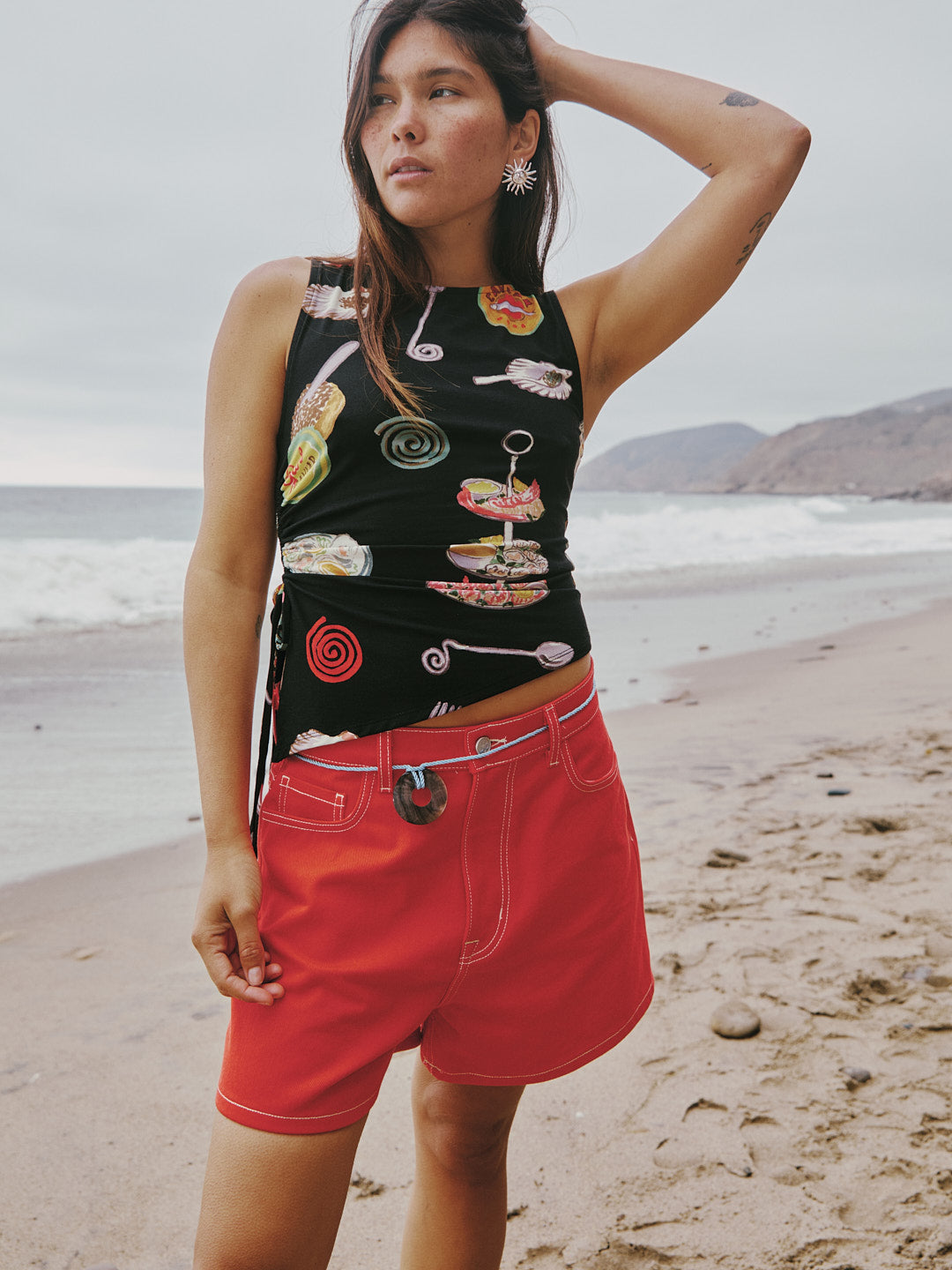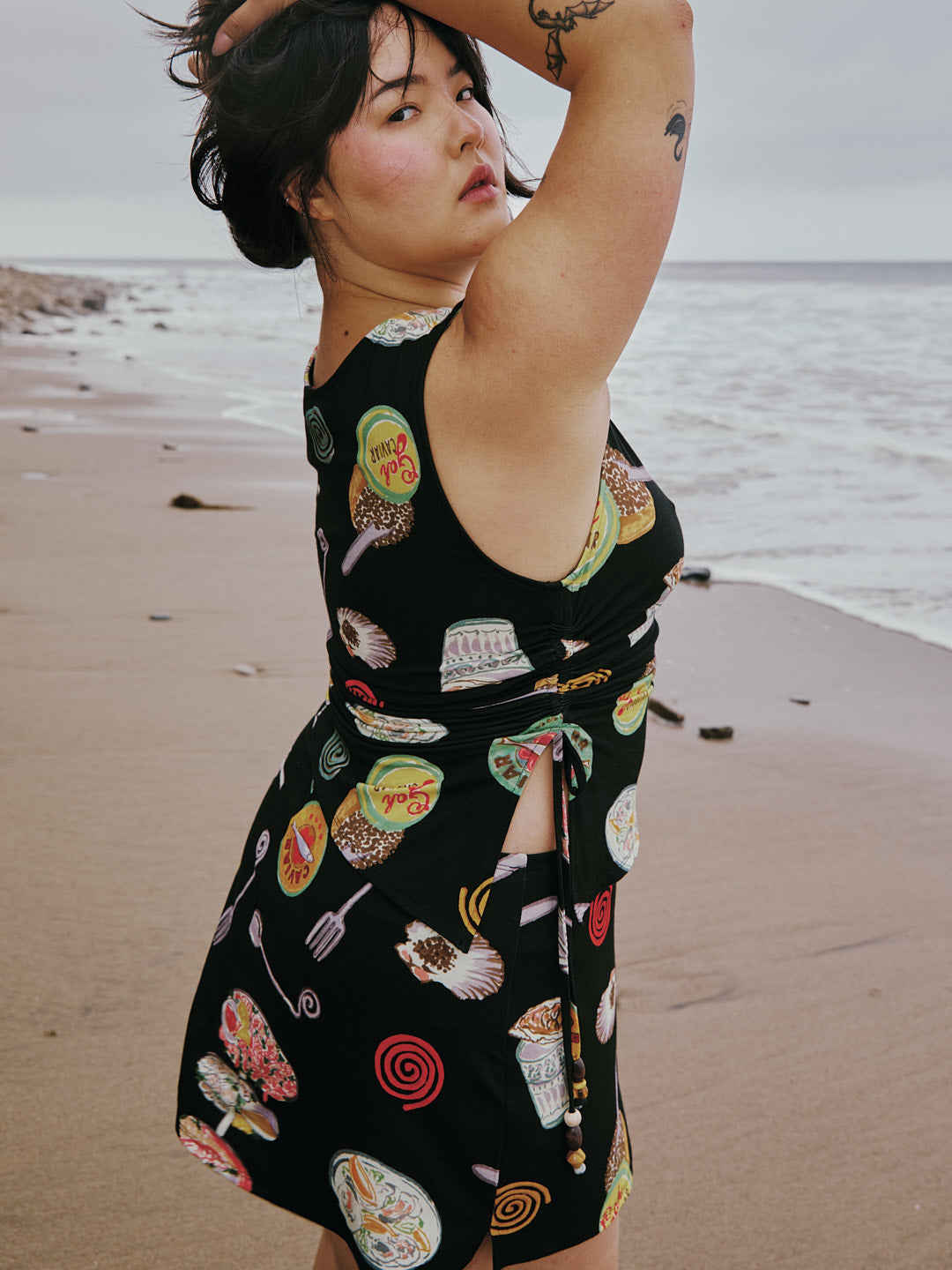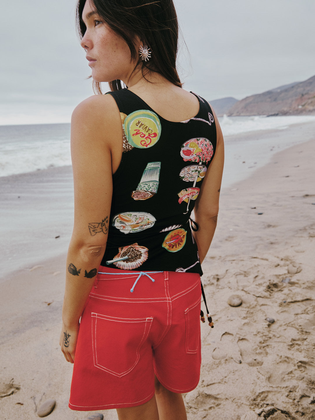 The Erin Tank is a form fitting, sleeveless tank top with side ruching tie details with wooden beads and an asymmetrical hem. Featured in our signature Caviar Dreams print in black.