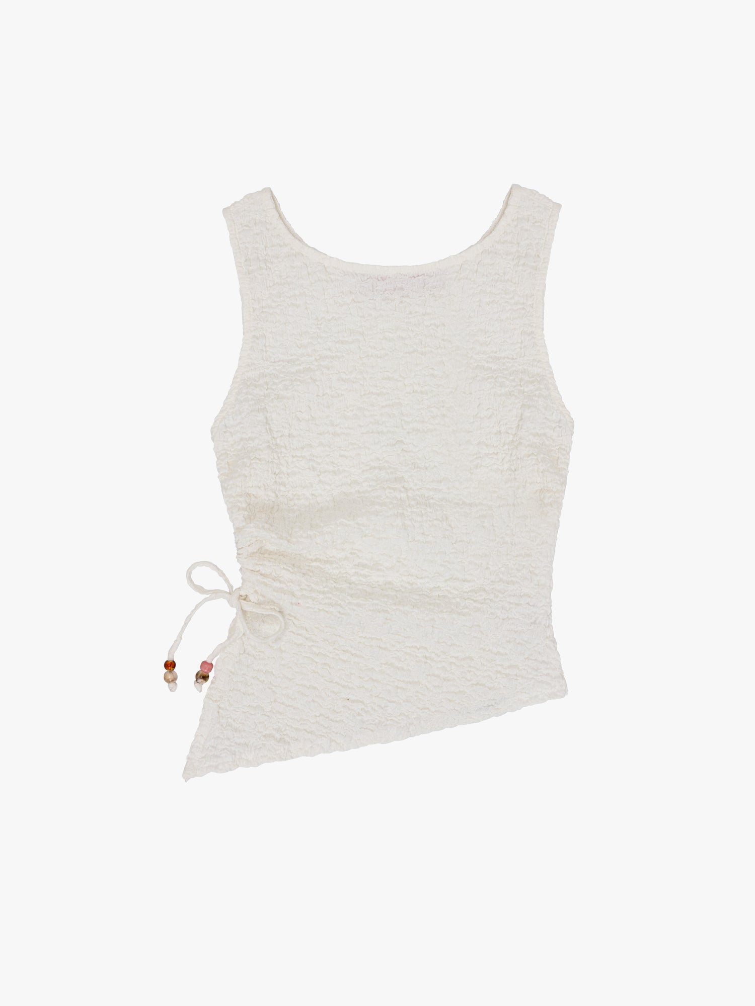 The Erin Tank is a form fitting, sleeveless tank top with side ruching tie details and an asymmetrical hem. Featured in a white crinkle fabric.