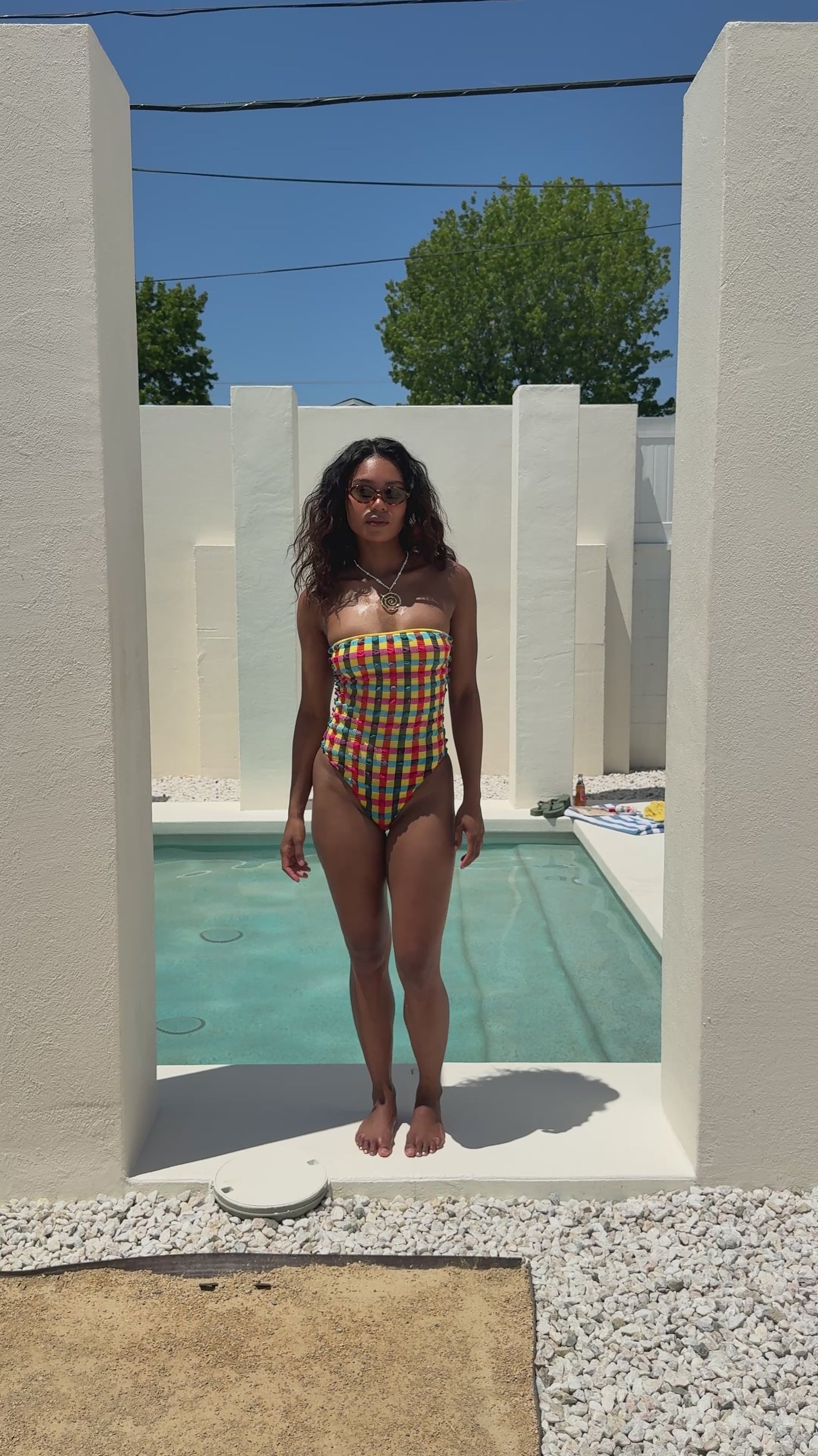 Introducing the Estela Swimsuit from Caro Luna—This one-piece swimsuit featured in a colorful seersucker gingham is your new summer go-to.