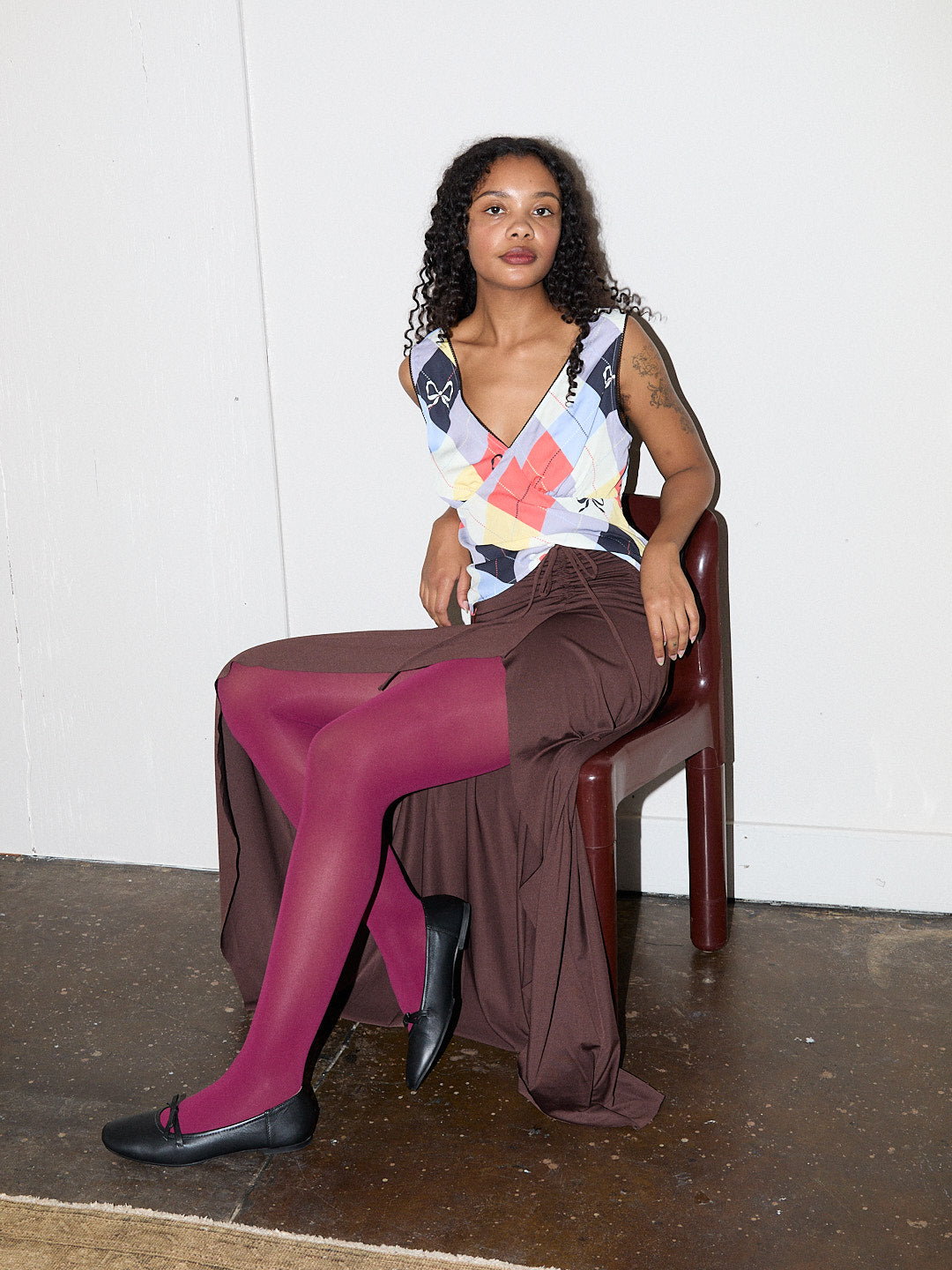 The Eucalyptus Skirt features a ruffle maxi design with an asymmetrical side split and flattering waist ruching. Unlined for a lightweight, airy feel, this skirt combines playful details with effortless elegance, making it a standout piece for any occasion.