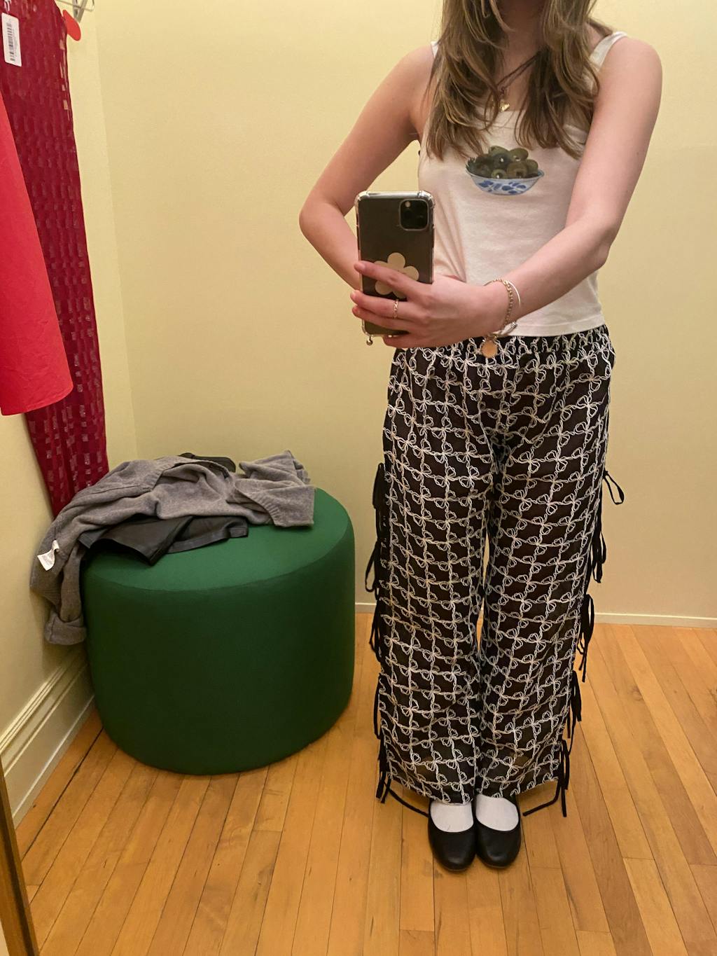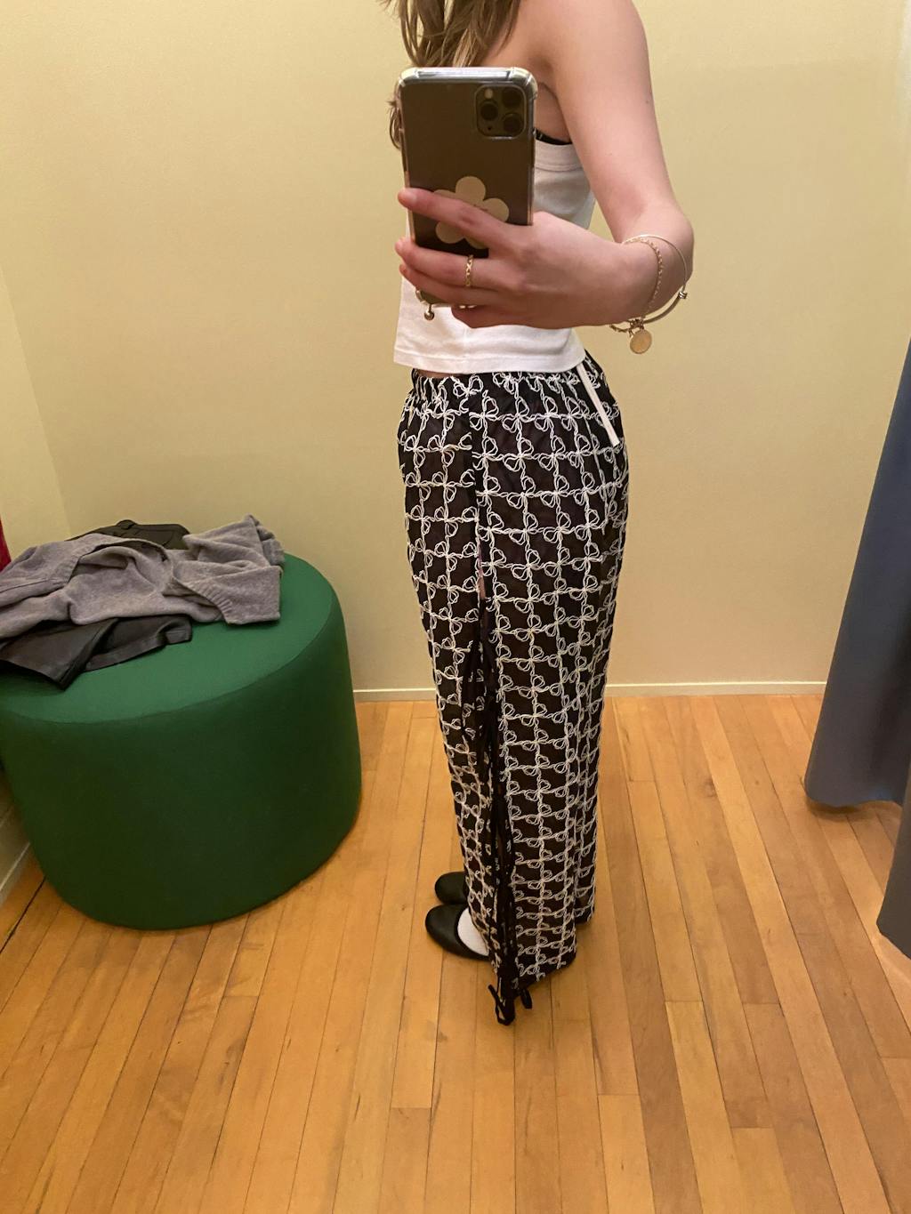 The Evelyn Bow Tie pants are adorable. The material is so unique. It’s sheer, but has a dark shadow making the pants not see through! I’m wearing an XS/S which fit perfectly. I’m 5’4 and the length was really good with my flat shoes. They are a high waist fit. Such a fun eye catching pant!