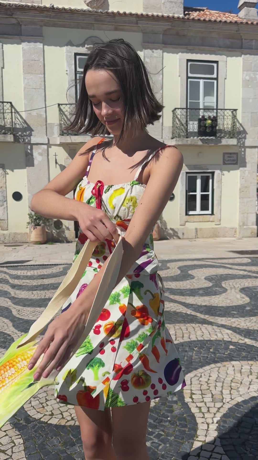 Mini wrap skirt featured in a fun farmer's market vegetable print.