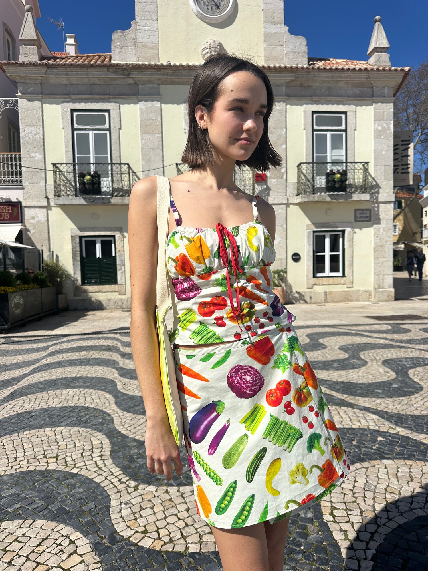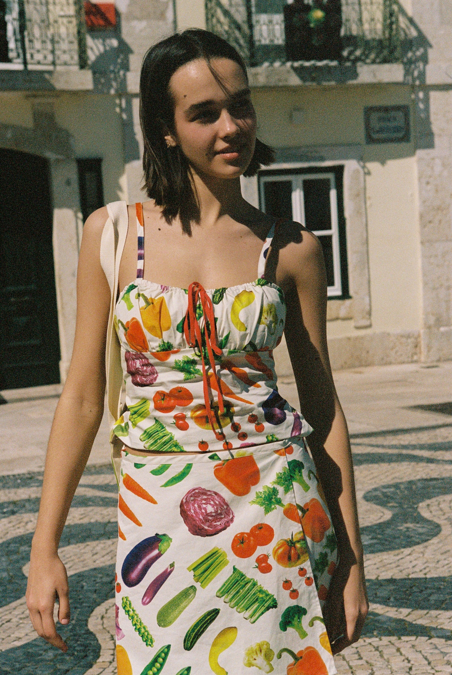 Tank top featured in a fun farmer's market vegetable print with a ribbon bow detail at the front.