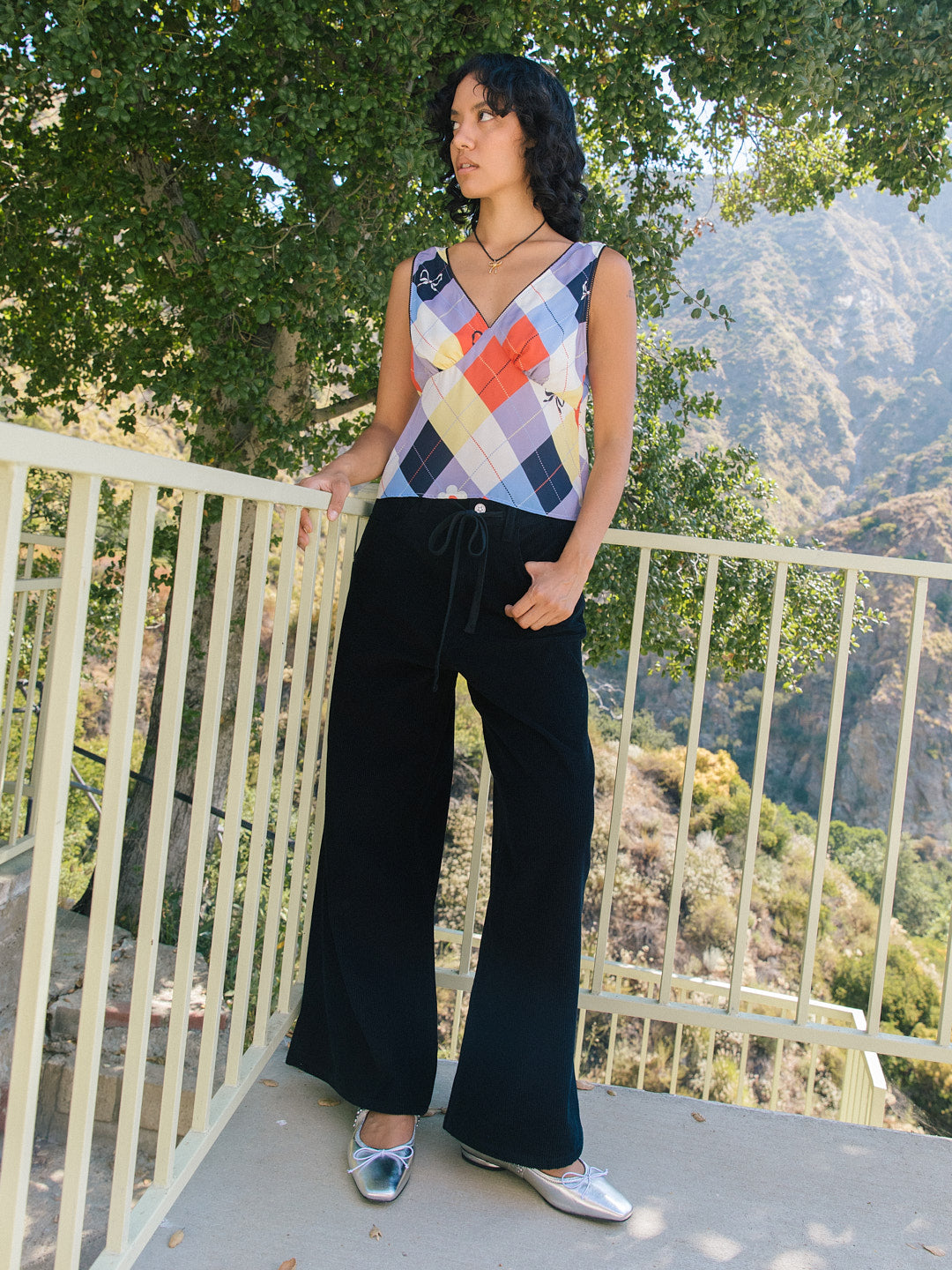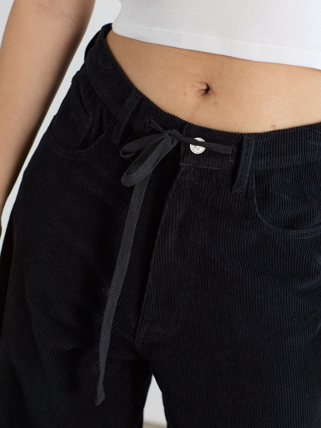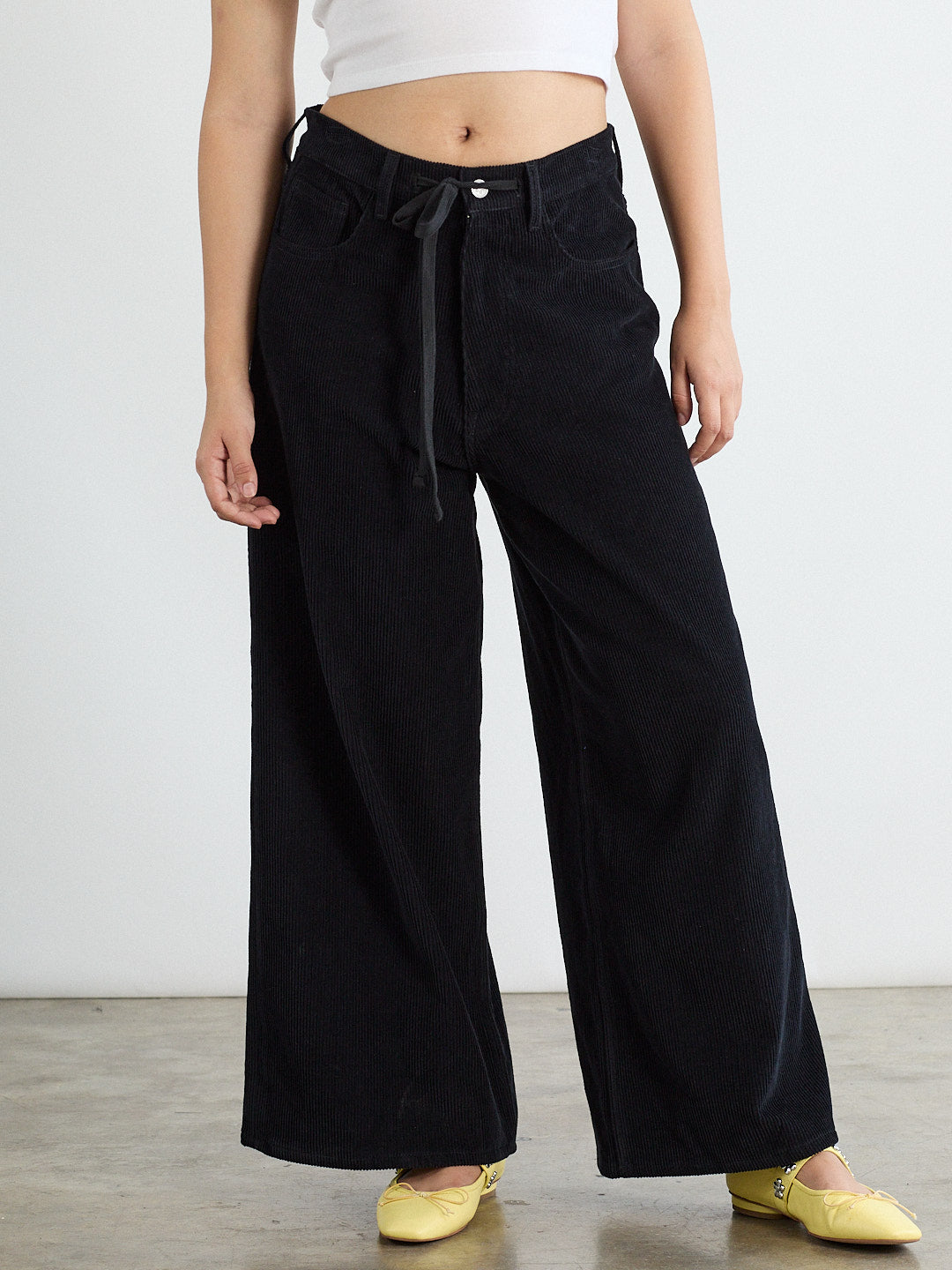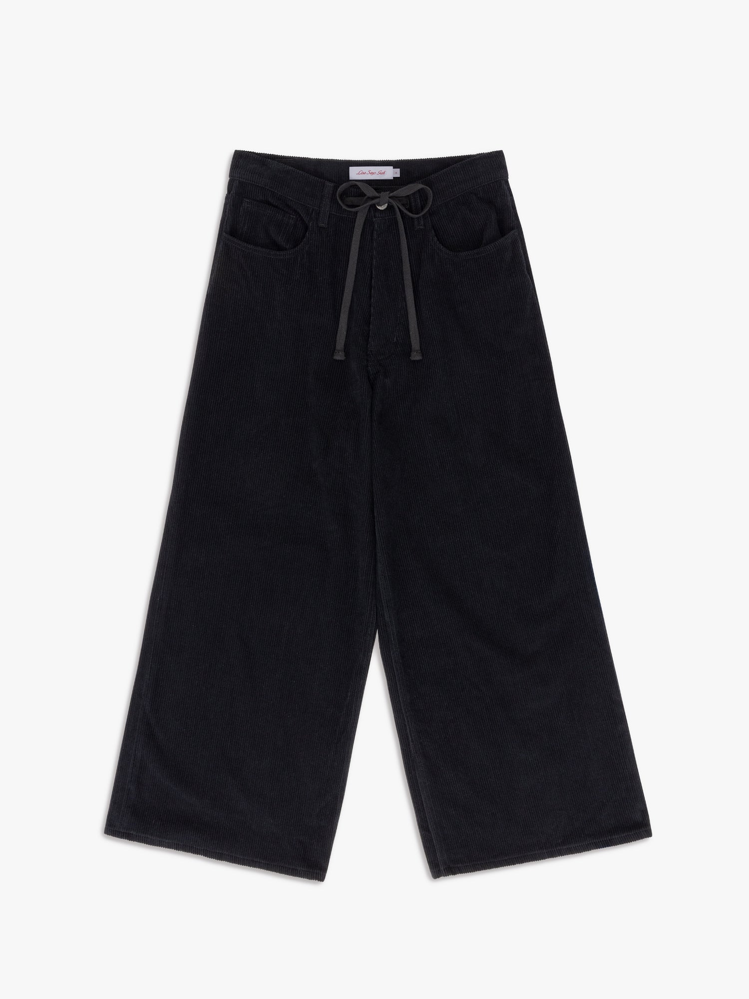 A wide leg pant with a loose baggy fit featuring an extra adjustable drawstring to wear it fitted at the waist or low waist. Features a signature Gah! patch at back. Made with a heavy corduroy fabric.