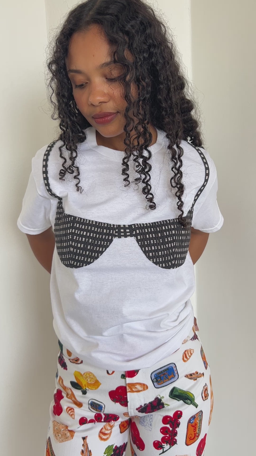 Oversized boxy white T-shirt with applique smocked bikini top. Each bikini is handmade from vintage fabric in NYC.