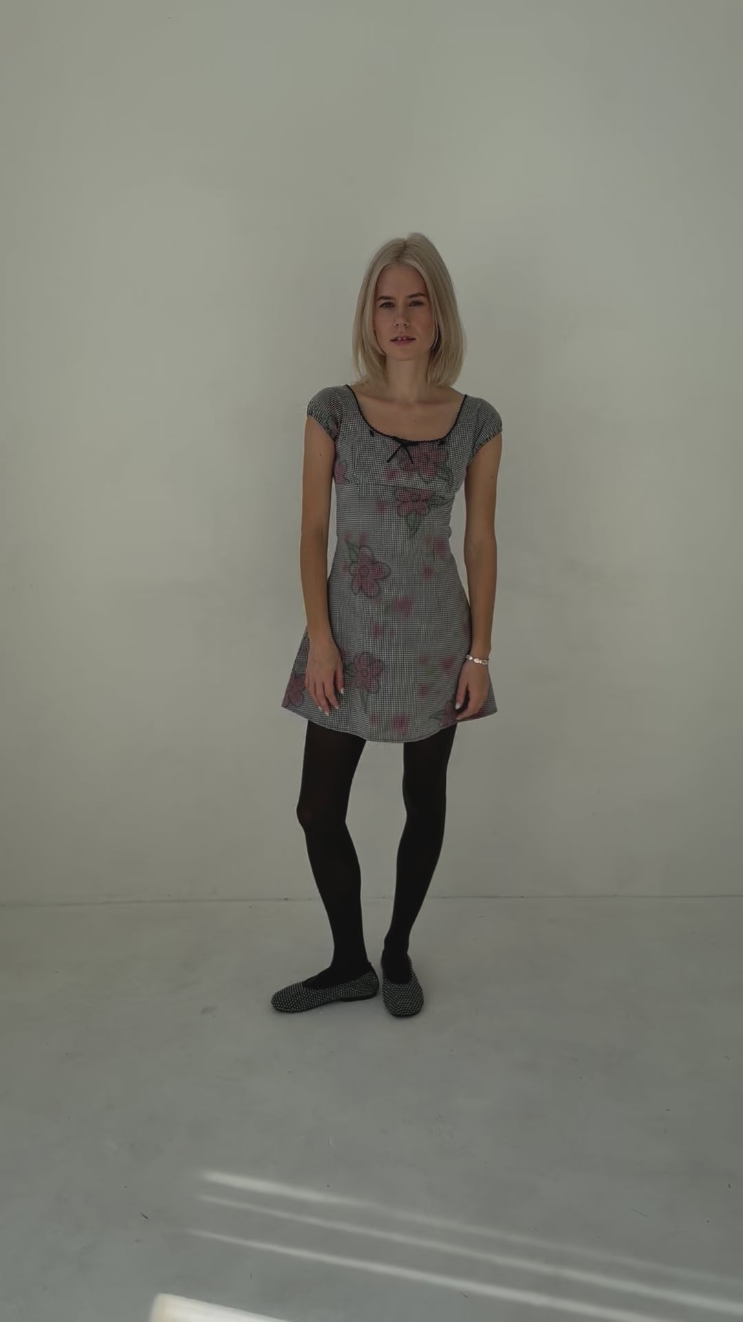 Mini dress featuring a fun floral print overtop a black and white gingham pattern with delicate black trim details, cap sleeves, and a bow at front. Closure at side with a smocked back panel and a tie at back for size versatility. This dress runs small. We recommend sizing up!