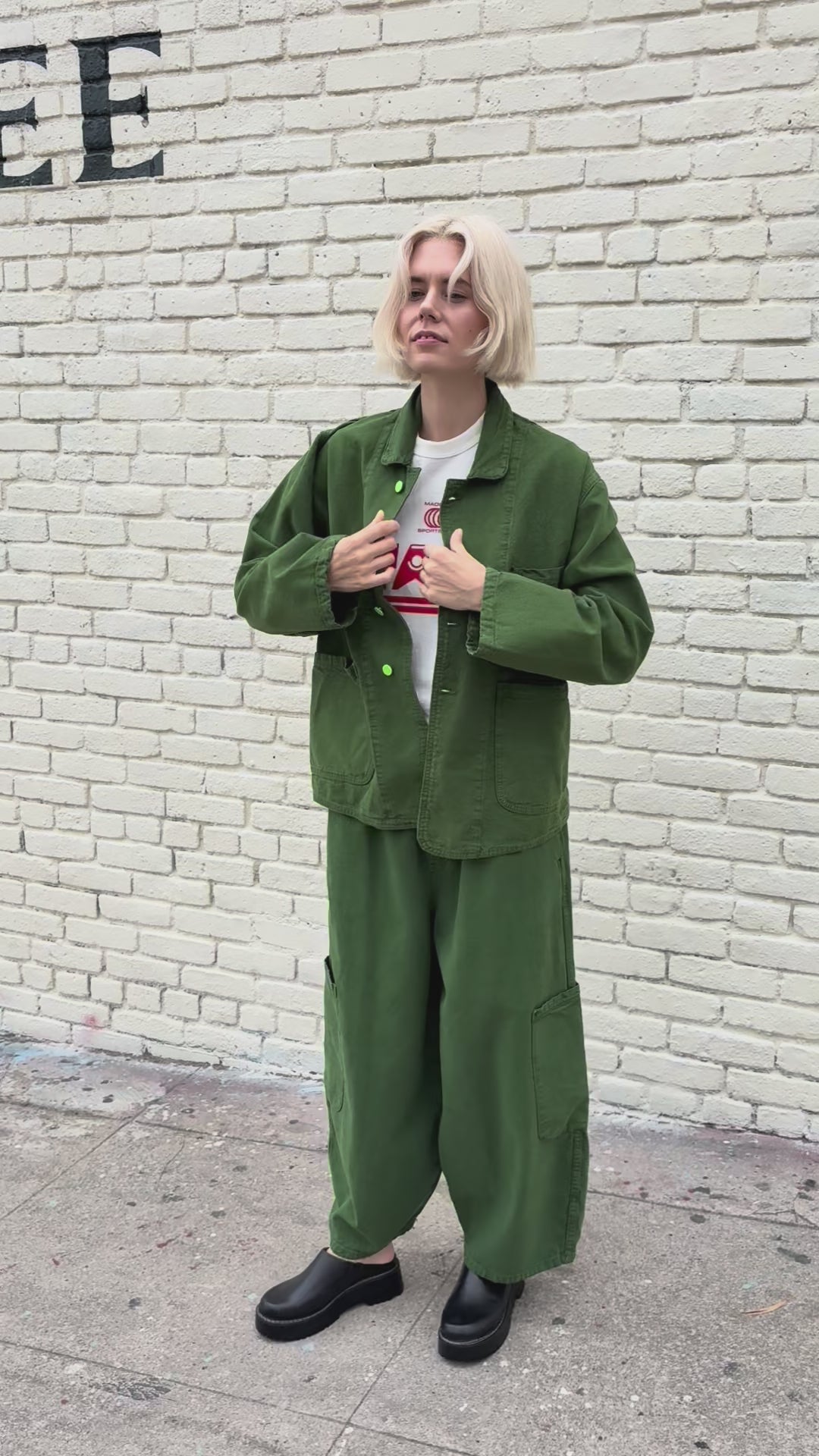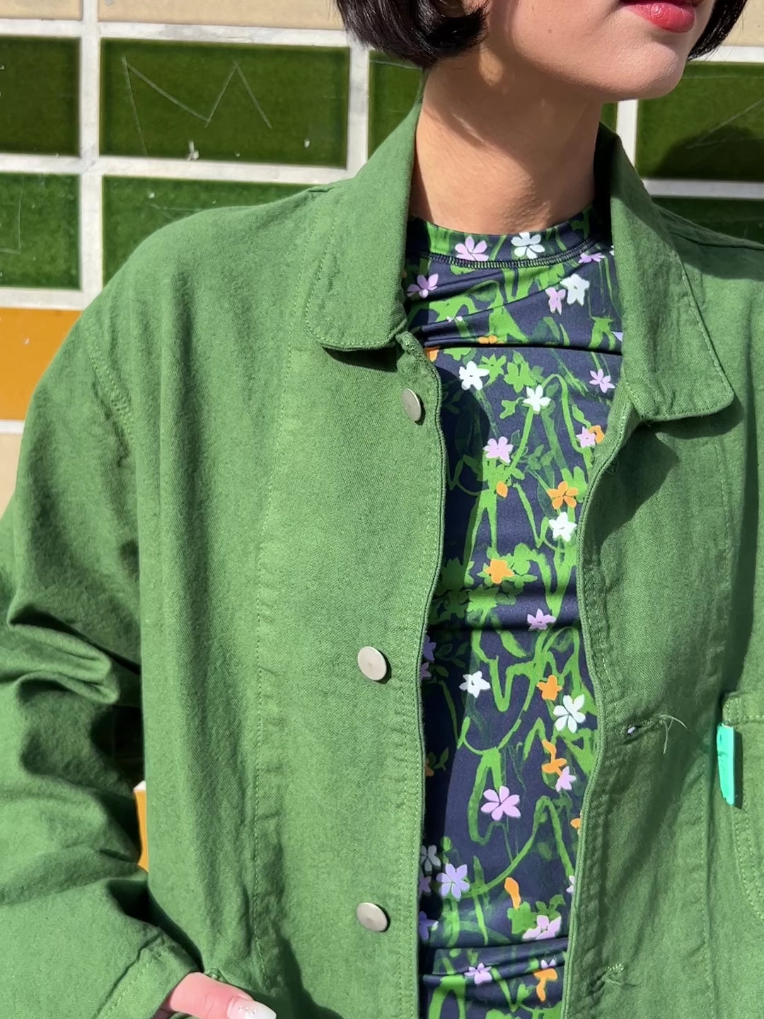 Boxy chore jacket made in a 100% cotton, dyed canvas. Designed and manufactured in Los Angeles and features neon green buttons and plenty of pockets for versatile wearing.