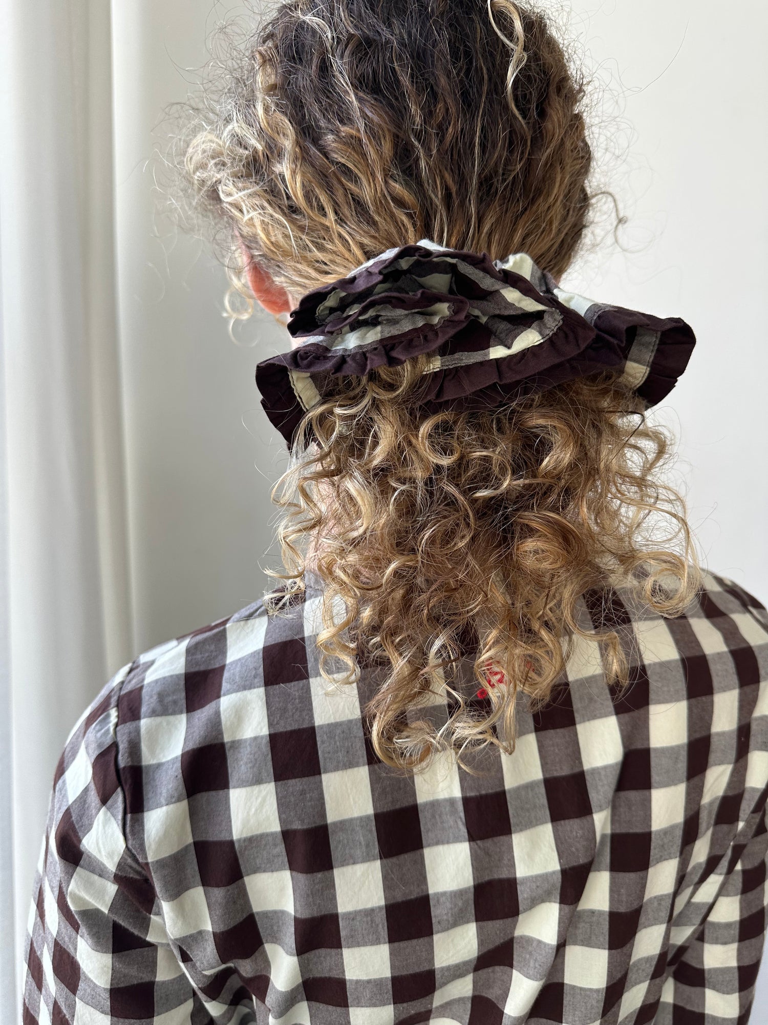 Oversized scrunchie in Butter Gingham from Damson Madder. Made from 100% organic cotton and designed to pair perfectly with matching DM clothing.