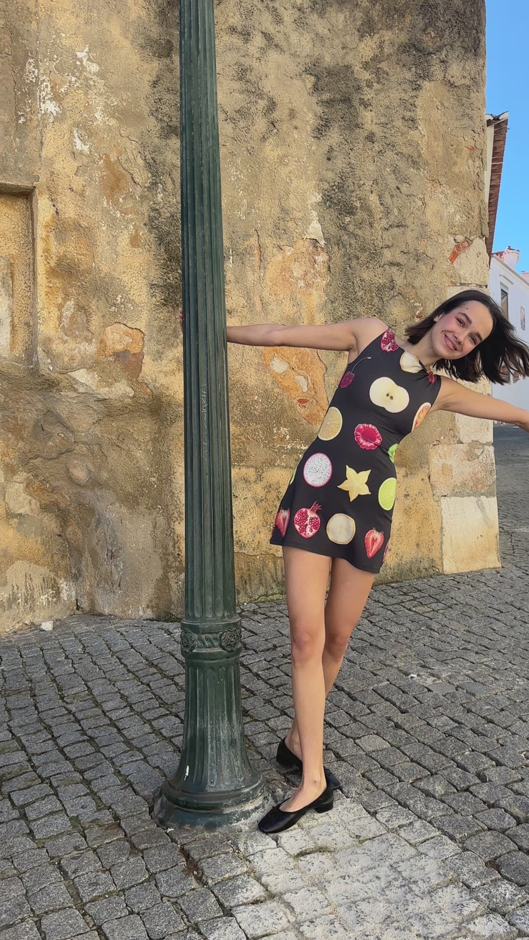 Mini dress with a high boat neckline, featured in a fun fruit slice print. Soft and stretchy for a comfortable fit. Please note that this dress may run slightly small. Customers recommend a size up.