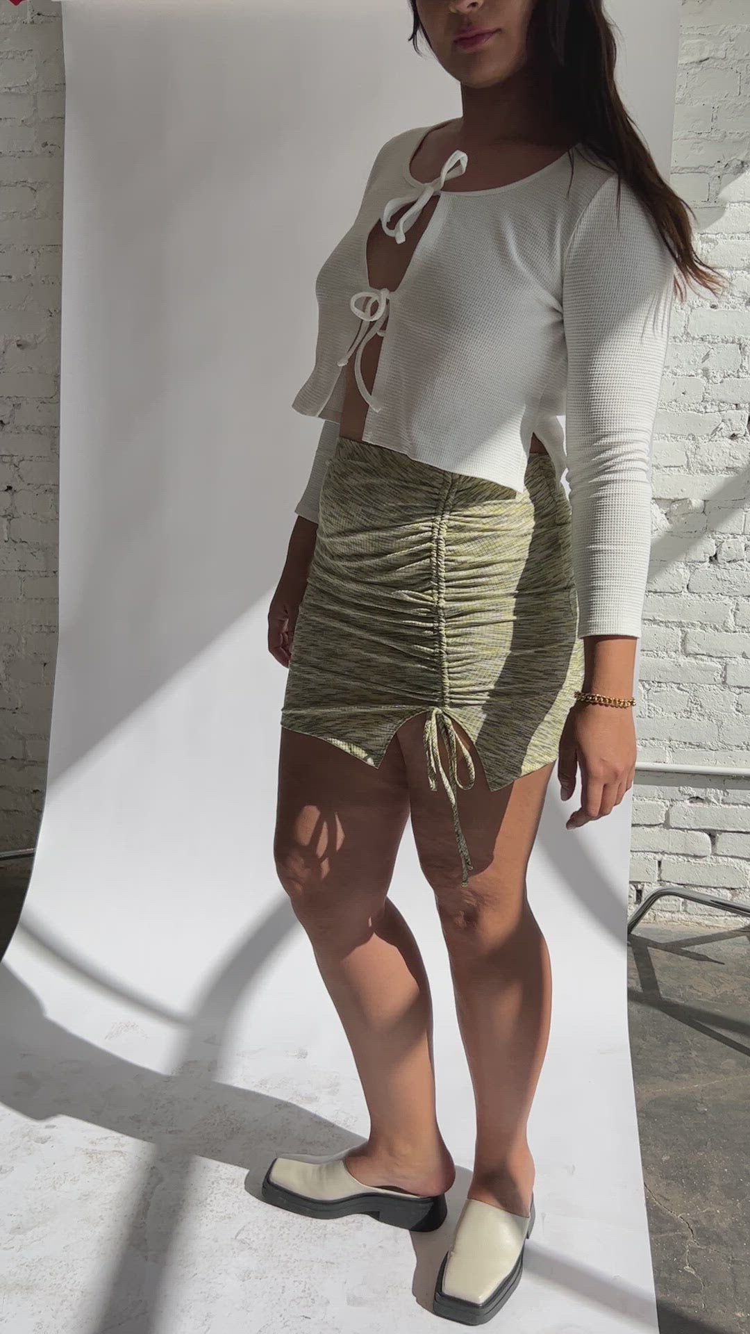 Minis are back! The Gem Mini is a stretchy knit mini with an adjustable side tie and slit.