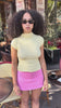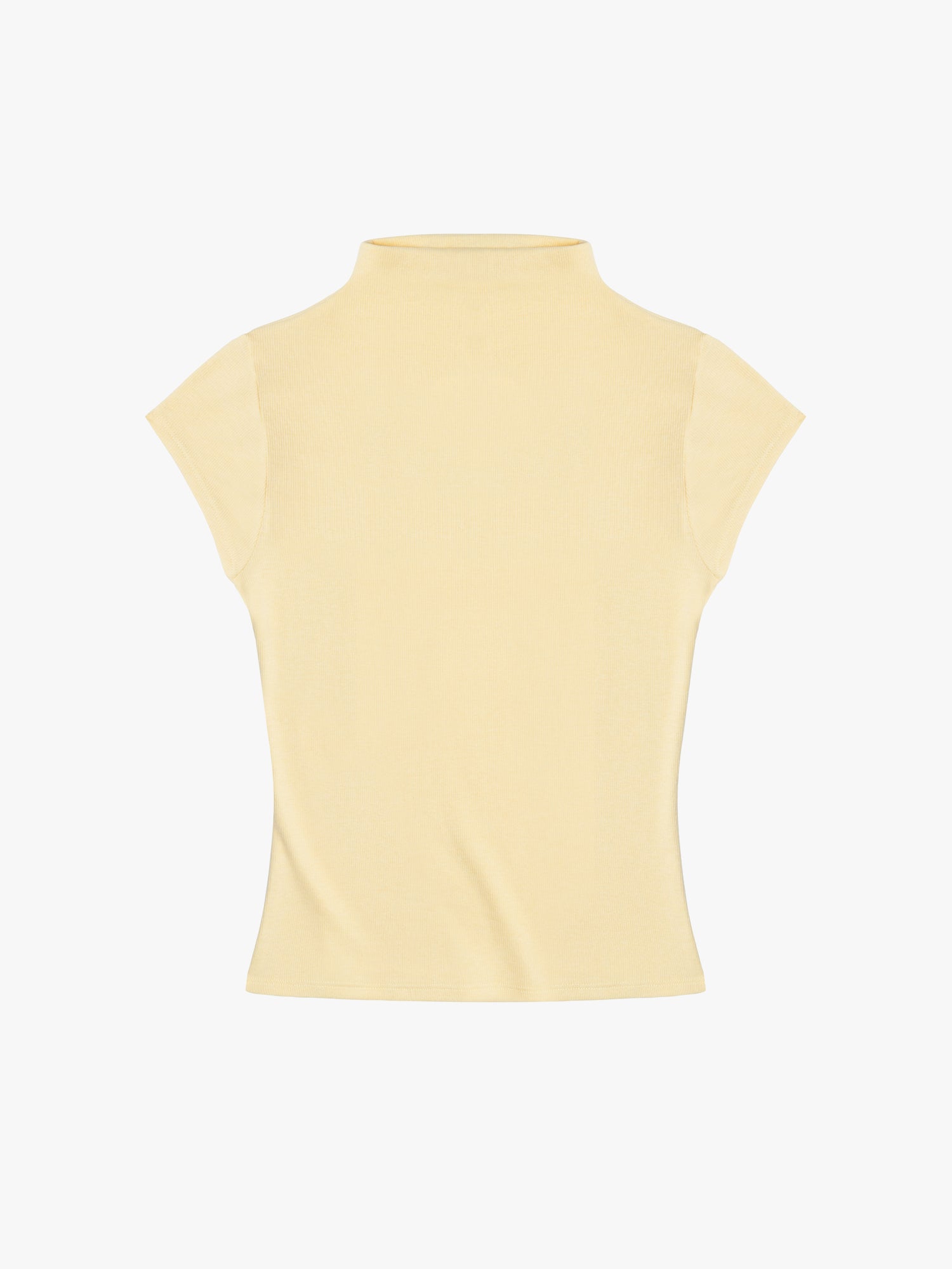 Introducing the Gem Tee from Geel—This cute top is perfect for any occasion, adding a playful touch to any outfit. A skimming-fitted cap sleeve tee featuring a mock neckline in pale yellow.