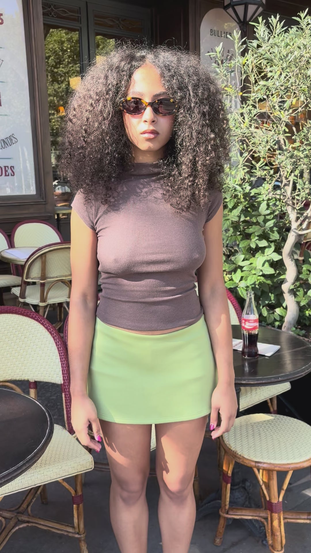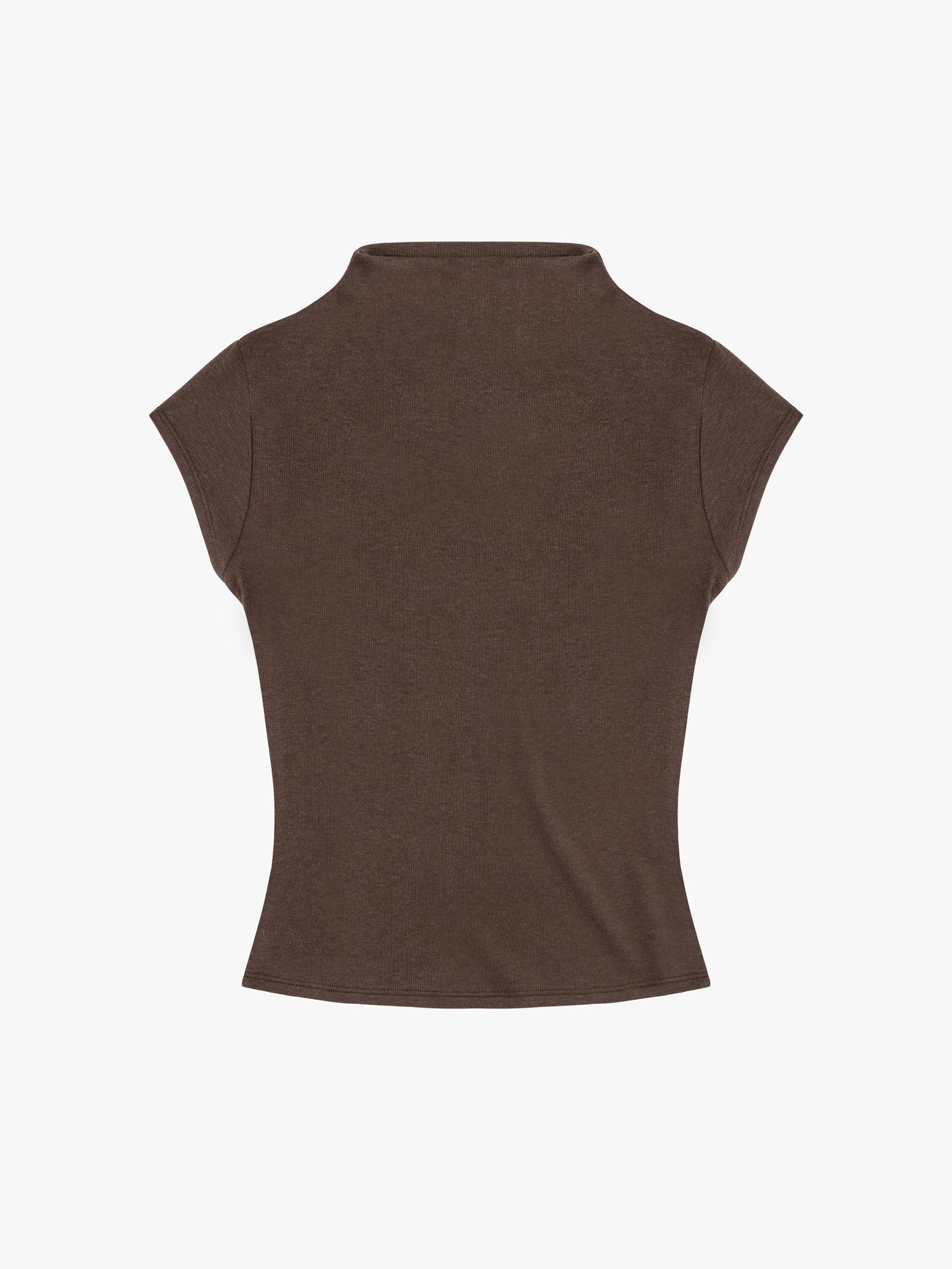 Introducing the Gem Tee from Geel—This cute top is perfect for any occasion, adding a playful touch to any outfit. A skimming-fitted cap sleeve tee featuring a mock neckline in brown.